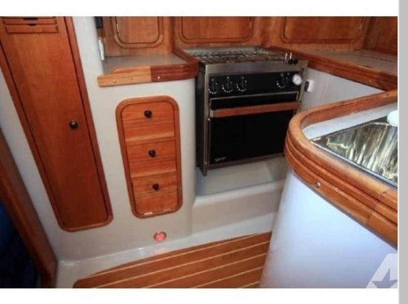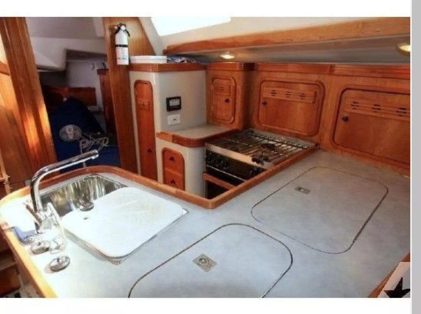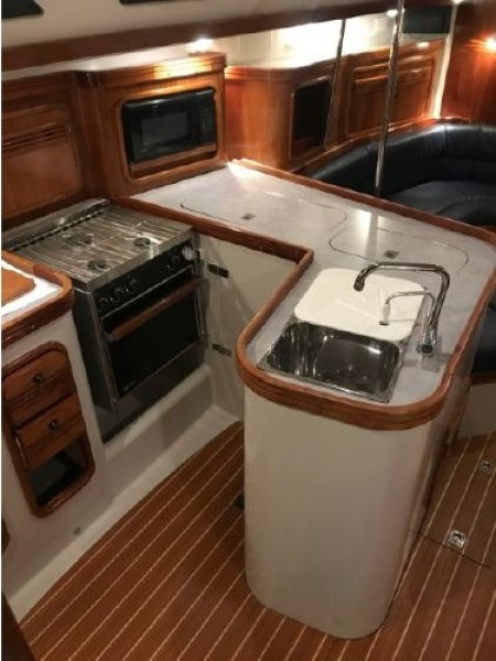 The U-shaped galley is to port, just aft of the main salon. It features expansive counter space with twin stainless-steel sinks, a gimbaled three burner Force 10 LPG stove with oven, and a microwave oven. 3 drawers and ample storage space. The front and top loading refrigerator/freezer, with Isotherm refrigeration, and an easily accessible Wet locker.