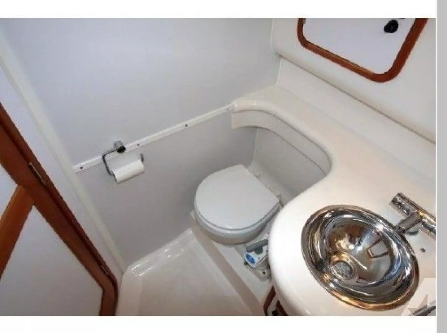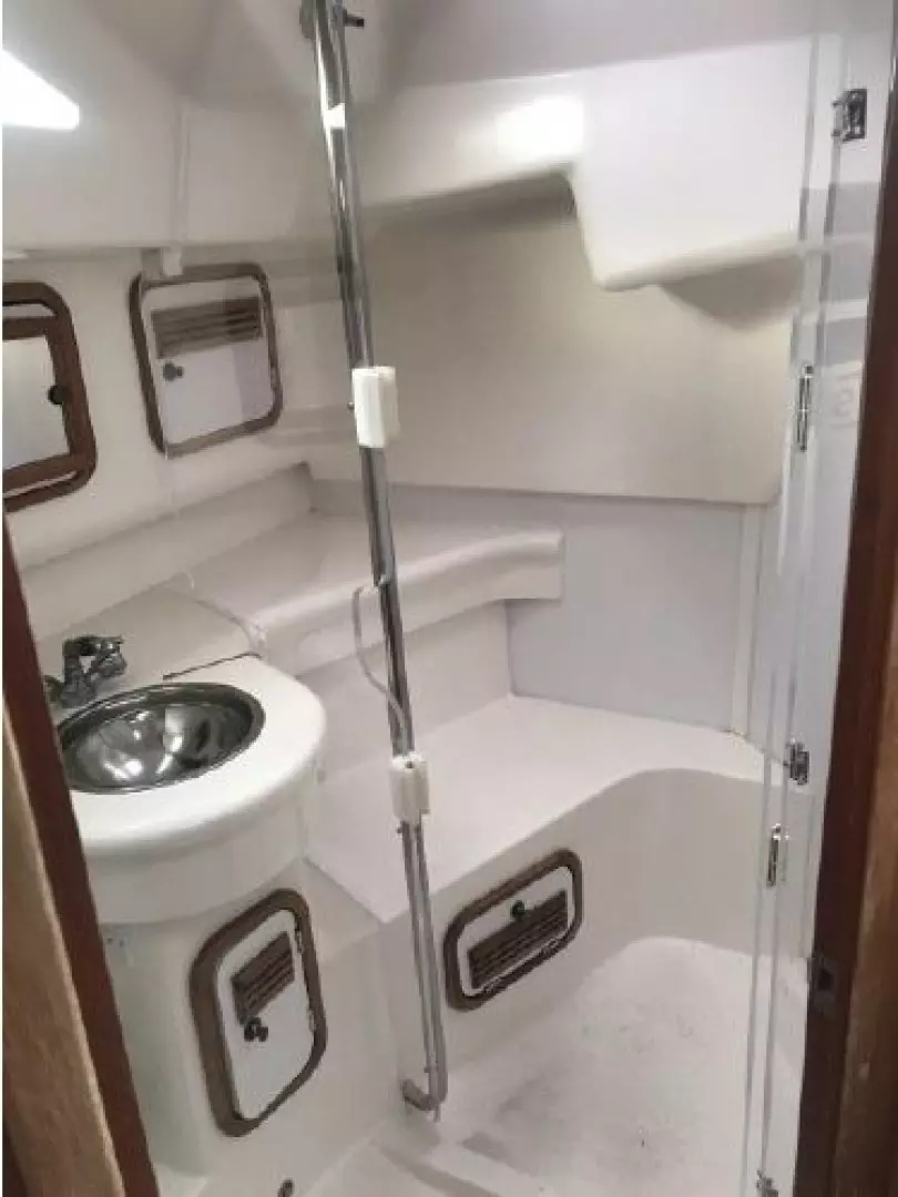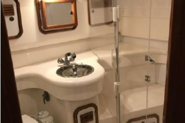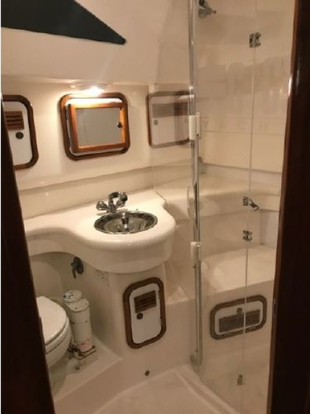 Aft of the nav station to starboard the spacious head featuring a separate shower stall with Lexan door, a Jabsco Electric Flush marine toilet with holding tank, a solid surface vanity with a stainless-steel sink, and a mirror and ample storage above