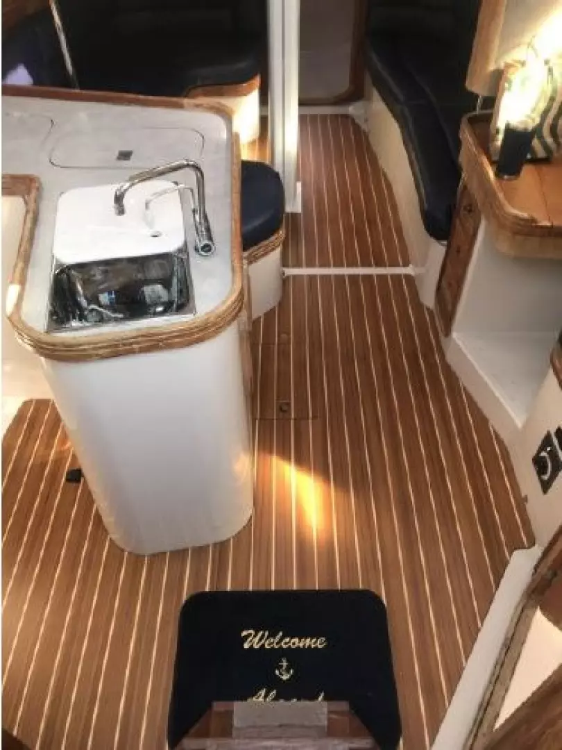 - Engine access is though hinge up companionway steps and aft cabin removable engine compartment box