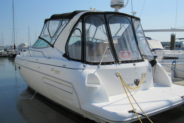 The Cruisers 3572 Express features ample topside appointments, generous accommodations, and the power and handling of a true performer. Belowdecks, there is a crescent-shaped, convertible dinette / sofa and a well-appointed galley with a double-burner electric stove, microwave, large refrigerator / freezer, and ample counter space. A privacy curtain separates the forward stateroom area from the salon. An optional bulkhead and door are available for additional privacy. Aft, a convertible sofa / sleeper provides accommodations for overnight guests. A privacy curtain may be drawn to enclose this living space. The head provides full standing headroom, a shower, and plenty of natural light. In addition to a wetbar, cockpit shower, refrigerator or ice maker, and plenty of seating, the 3572's above-deck layout also includes an offset companionway and a walk-through windshield for easy foredeck access. The helm station offers ergonomically placed controls, superb visibility, and room for extras.