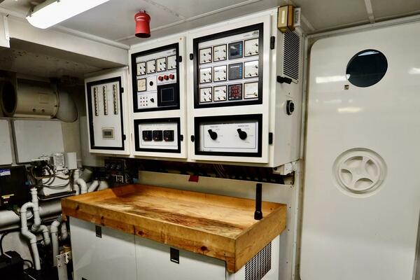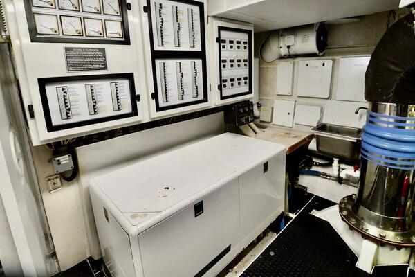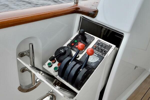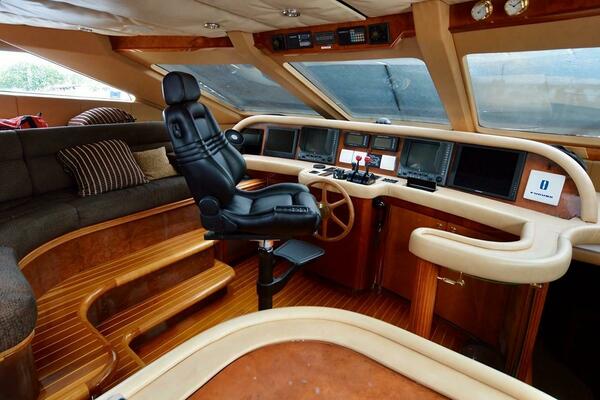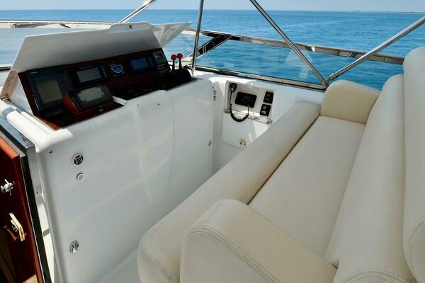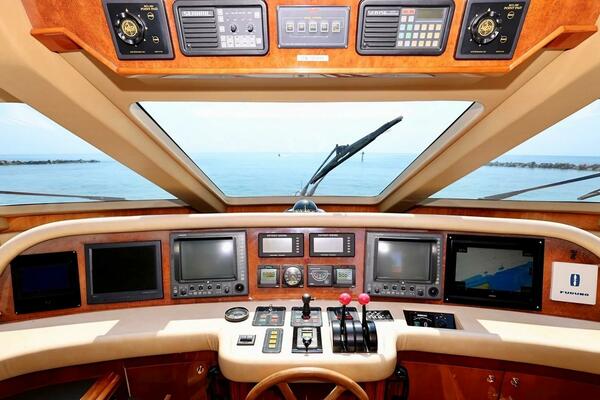 The raised pilothouse is accessible from the main deck and offers a commanding centerline helm station, complete with an electric Ricard captain’s chair. Highlights include: