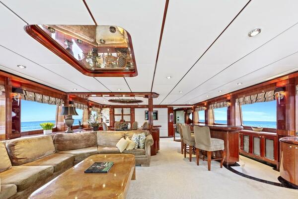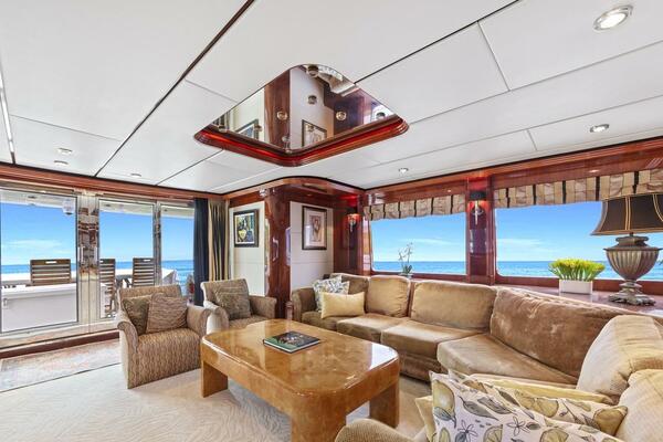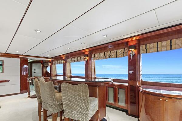 Enter through custom electric sliding chrome doors into an interior defined by high-gloss cherry wood finishes and a sense of understated grandeur. The full-beam salon offers an open and airy ambiance, enhanced by upgraded mechanical shades that frame sweeping ocean views. A well-appointed wet bar with ice maker and refrigerator ensures every occasion begins in style.