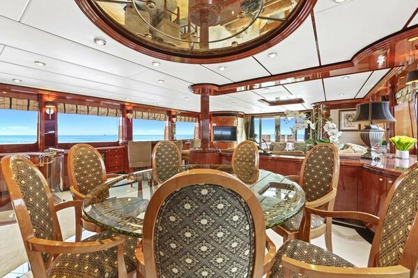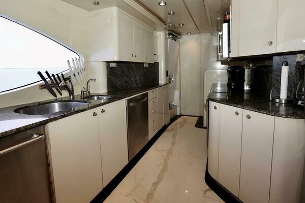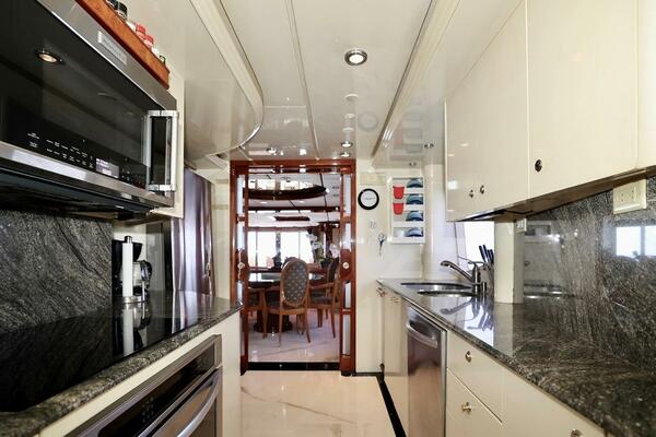 Located just forward of the salon, the formal dining area showcases a round table with seating for eight. The galley—both beautiful and functional—features marble countertops, a full-height backsplash, and discreet placement for seamless service.