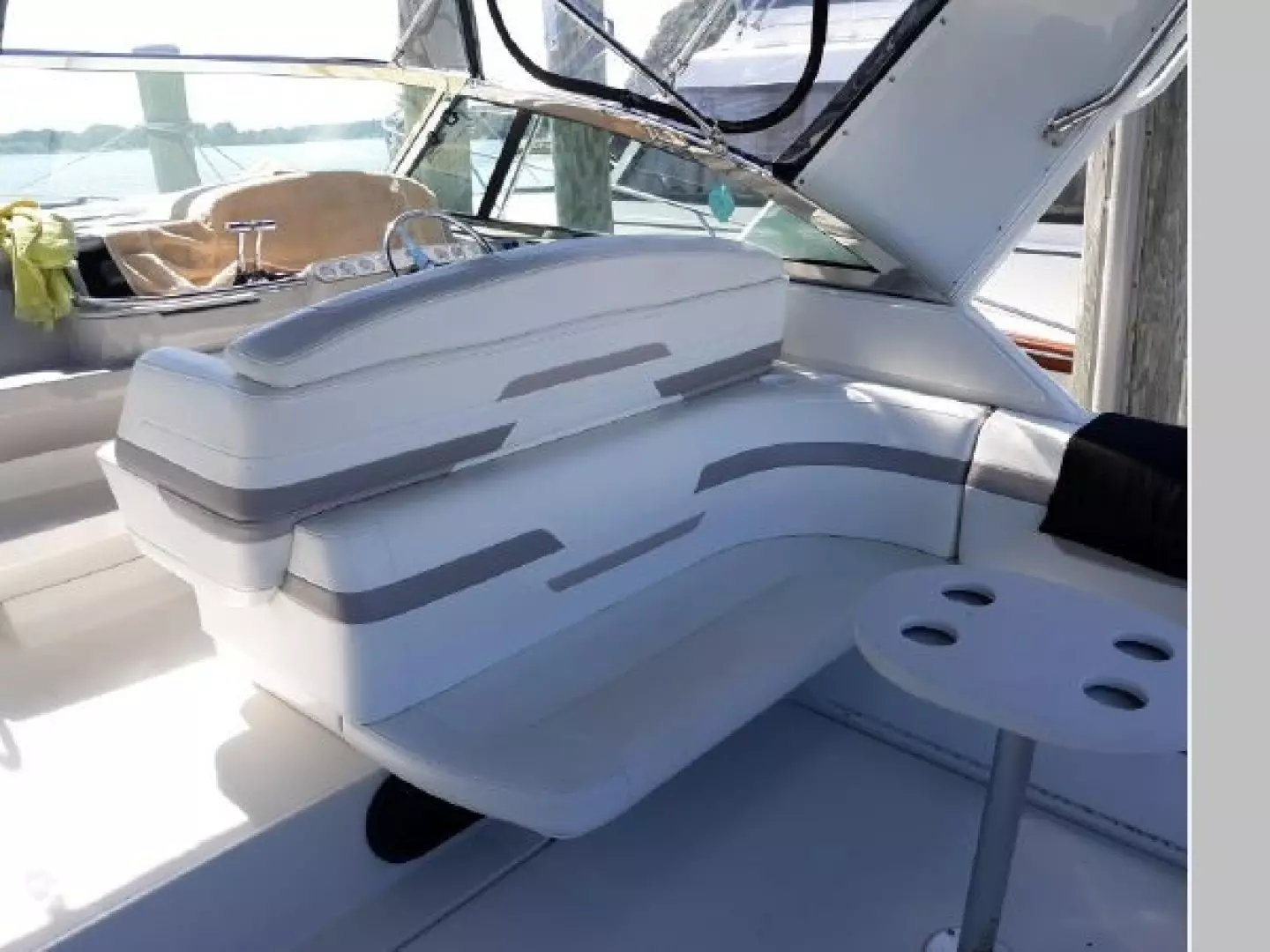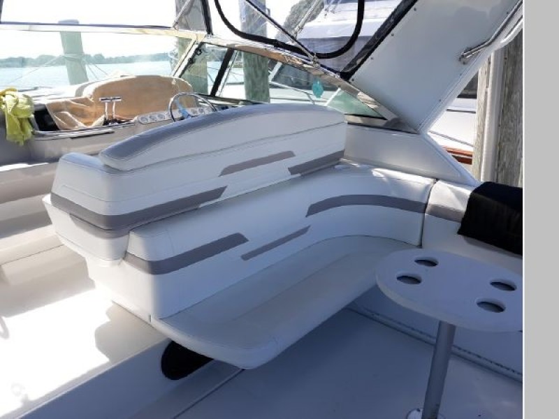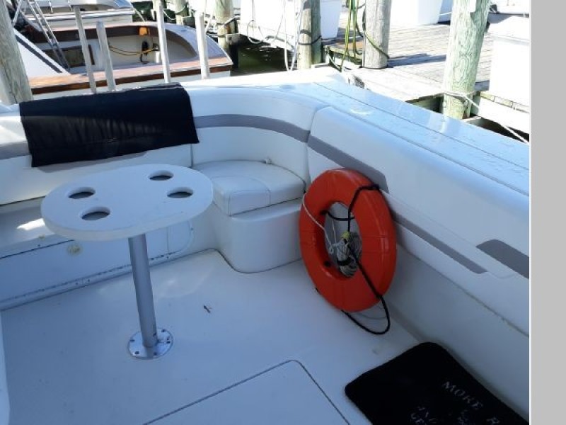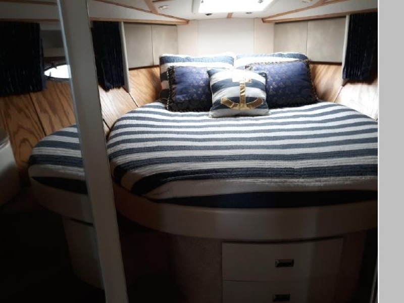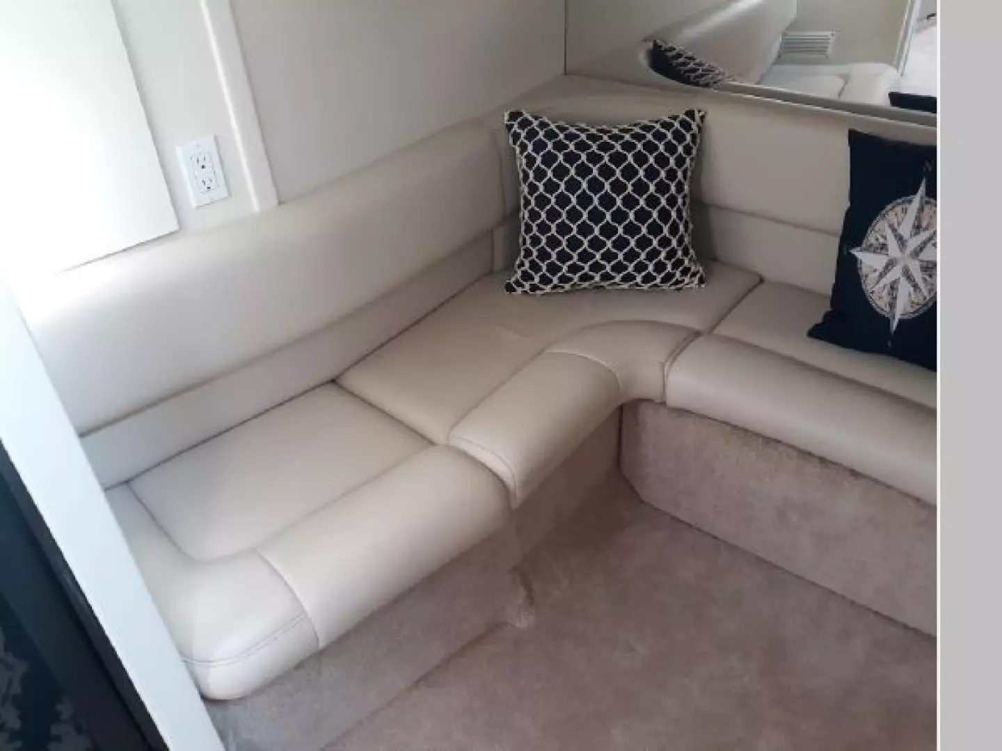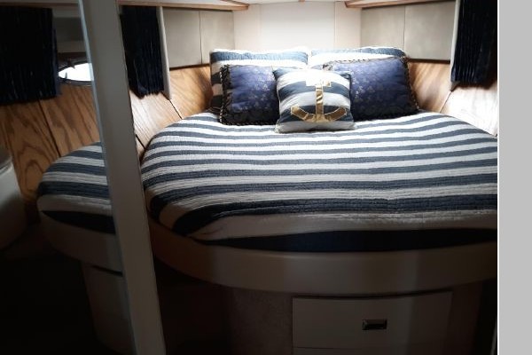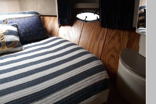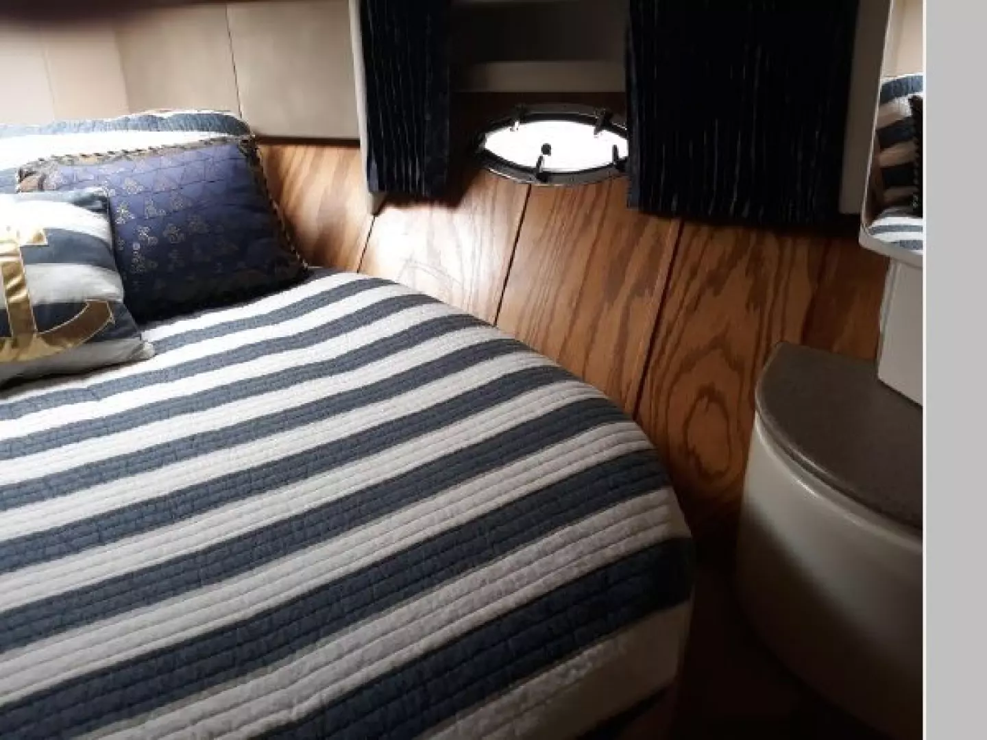 The master stateroom if forward with a center line queen bed, ventilation, hanging lockers and 2 opening ports. Aft to starboard is the head with vanity, sink, mirror and separate stall shower. Aft to port is the dinette area with 2 stools that also converts to a bed. Aft to starboard is the spacious galley area with all the amenities, full size refrigerator, and ample counter, cabinet and drawer space. Aft again to the aft stateroom with U-shaped seating and a table which also converts to a full size double bed. Up a couple of steps to the helm deck with the helm to starboard and an L-shaped settee to port. Aft to the cockpit with u-shaped seating to starboard and a wet bar with sink & refrigerator to port. Out the transom door to the swim platform with ladder.