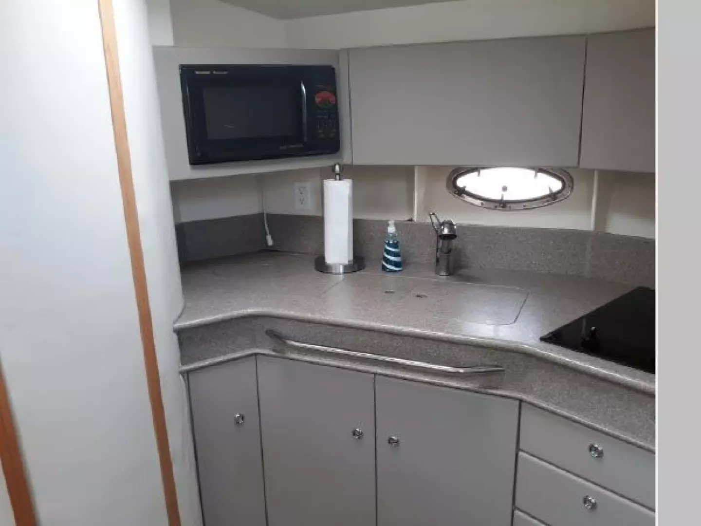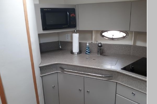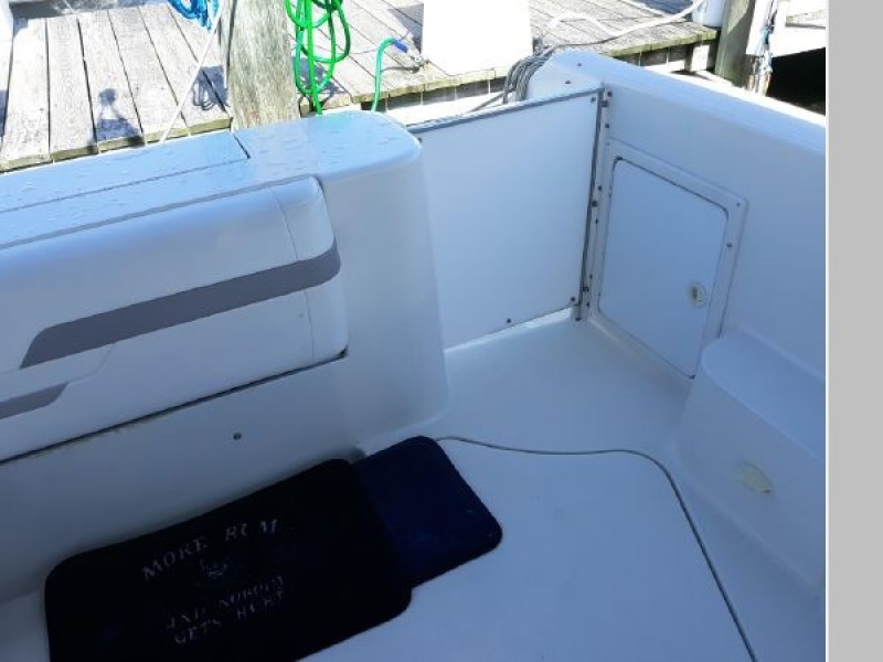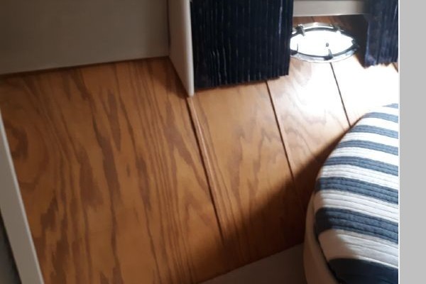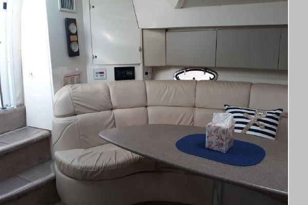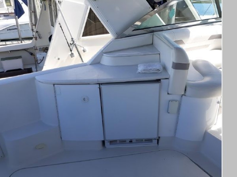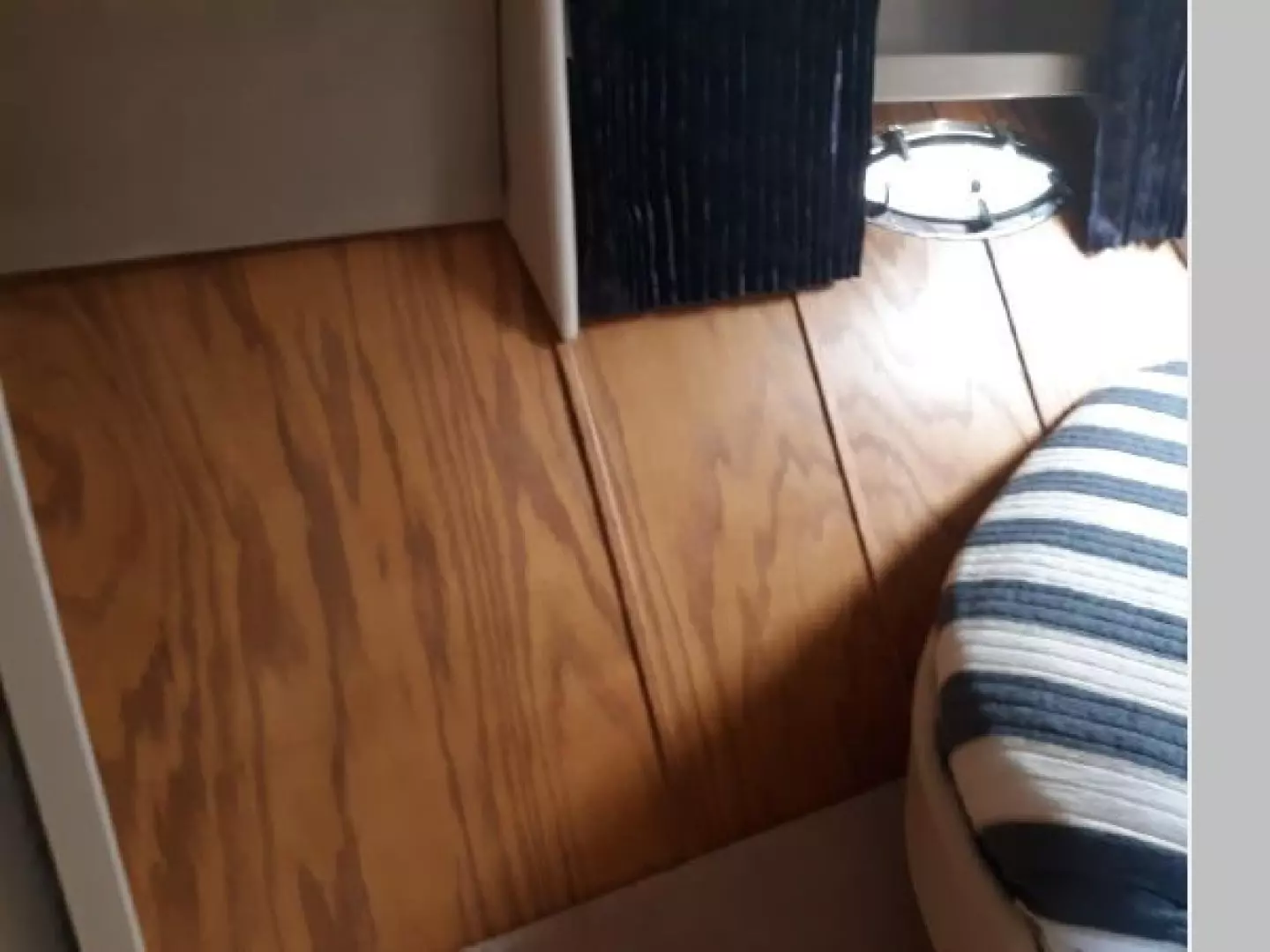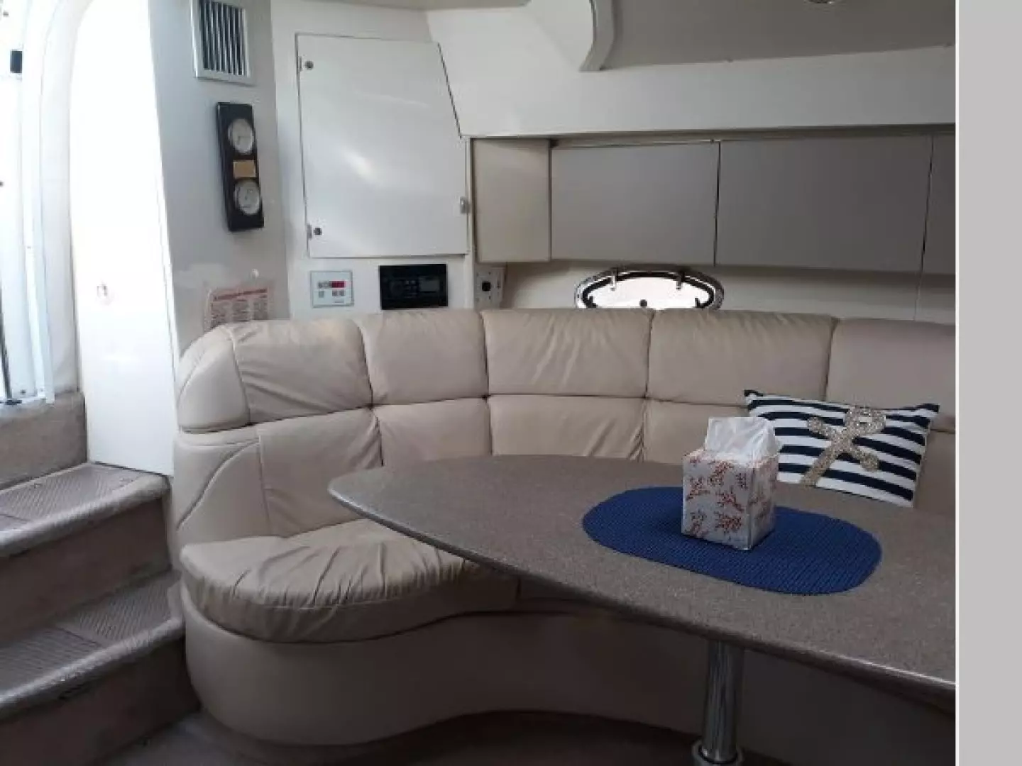 The master stateroom if forward with a center line queen bed, ventilation, hanging lockers and 2 opening ports. Aft to starboard is the head with vanity, sink, mirror and separate stall shower. Aft to port is the dinette area with 2 stools that also converts to a bed. Aft to starboard is the spacious galley area with all the amenities, full size refrigerator, and ample counter, cabinet and drawer space. Aft again to the aft stateroom with U-shaped seating and a table which also converts to a full size double bed. Up a couple of steps to the helm deck with the helm to starboard and an L-shaped settee to port. Aft to the cockpit with u-shaped seating to starboard and a wet bar with sink & refrigerator to port. Out the transom door to the swim platform with ladder.