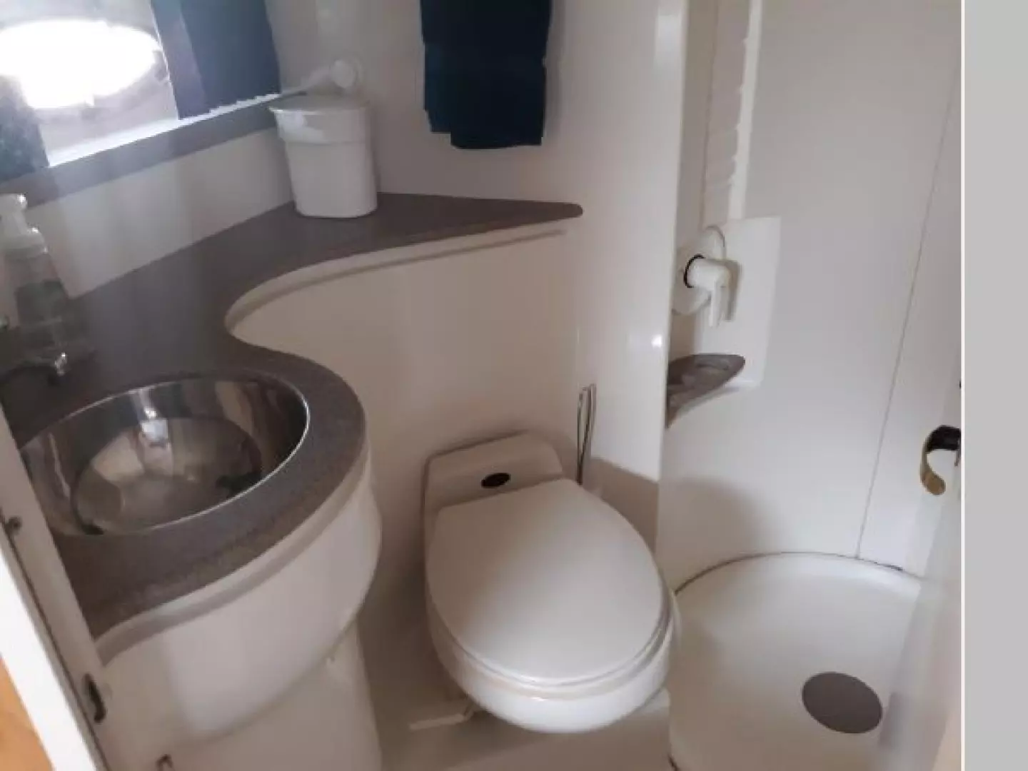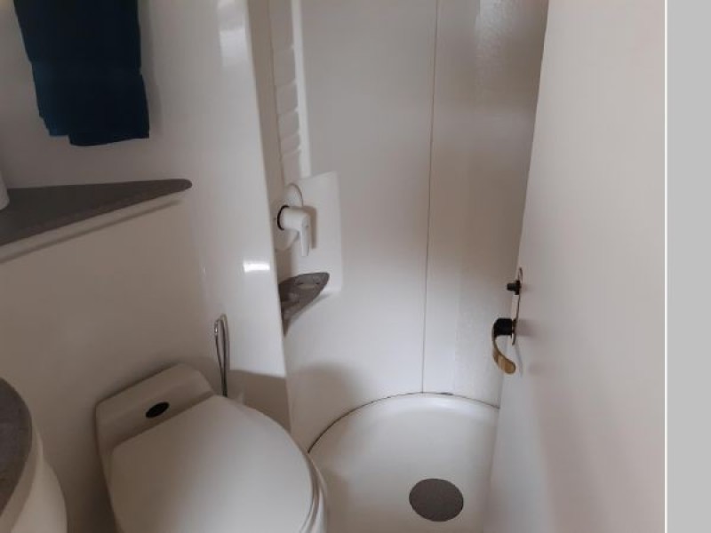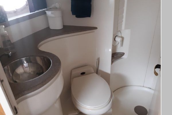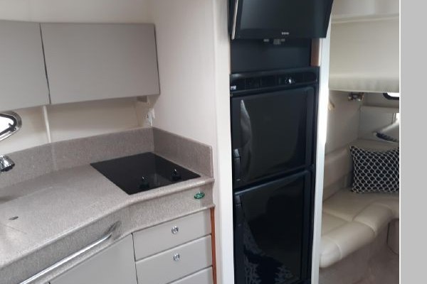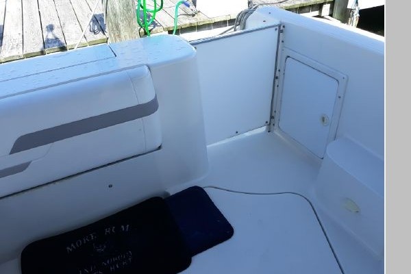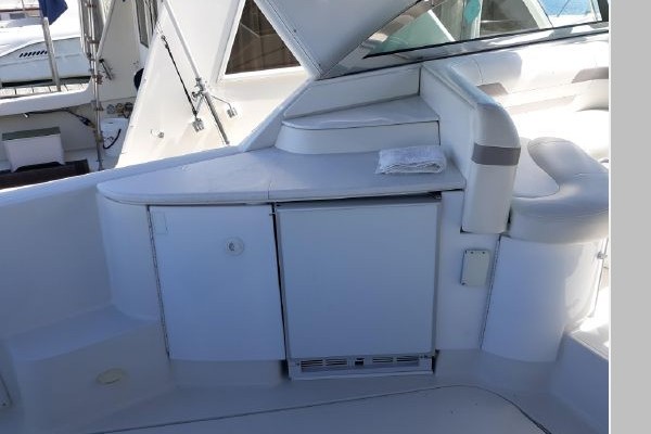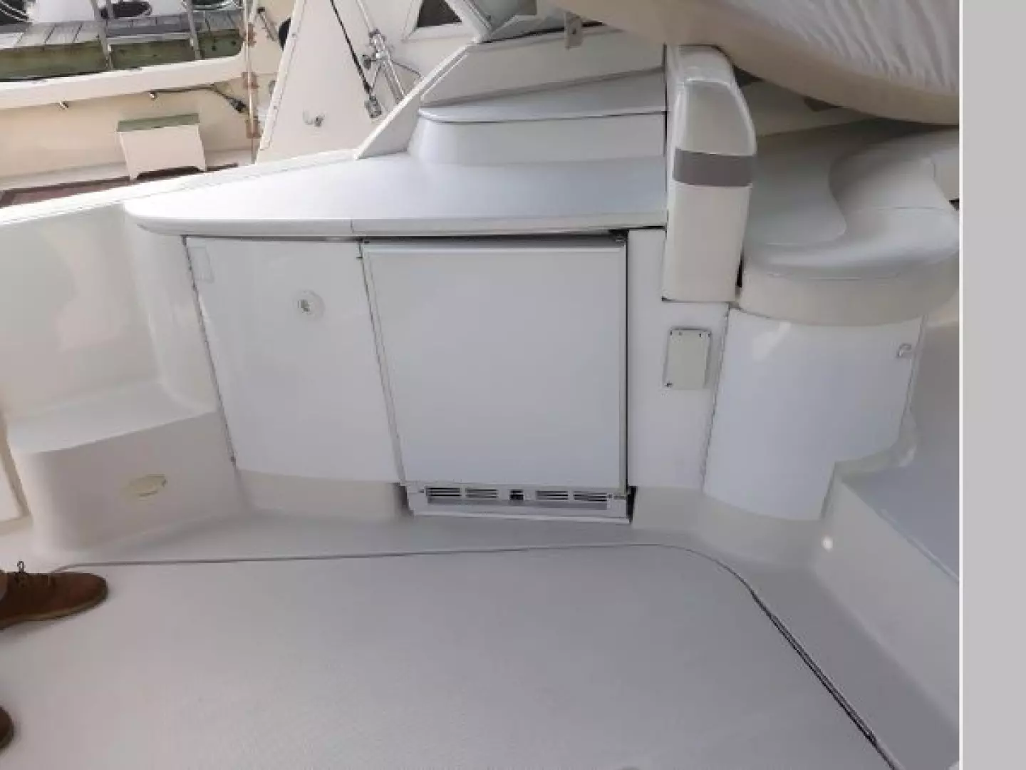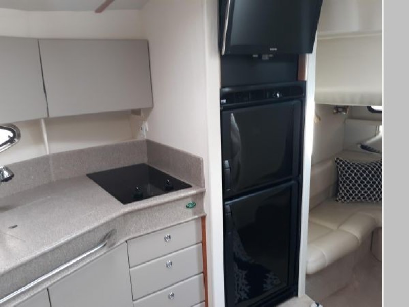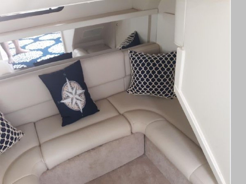 The master stateroom if forward with a center line queen bed, ventilation, hanging lockers and 2 opening ports. Aft to starboard is the head with vanity, sink, mirror and separate stall shower. Aft to port is the dinette area with 2 stools that also converts to a bed. Aft to starboard is the spacious galley area with all the amenities, full size refrigerator, and ample counter, cabinet and drawer space. Aft again to the aft stateroom with U-shaped seating and a table which also converts to a full size double bed. Up a couple of steps to the helm deck with the helm to starboard and an L-shaped settee to port. Aft to the cockpit with u-shaped seating to starboard and a wet bar with sink & refrigerator to port. Out the transom door to the swim platform with ladder.