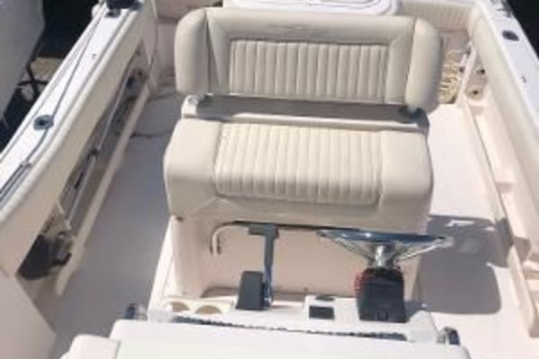 The Grady-White Advance 247 is a center console featuring an integrated outboard mounting system and the exclusive SeaV2 hull. The roomy 62-square-foot cockpit with raised forward casting platforms (with optional cushions) has two pedestal chairs and a molded-in aft cockpit with livewell. The livewell is centered, allowing access to both corners for fighting, wiring and gaffing fish. The console features a lockable electronics box, a windshield with handrails, and ample storage under the console footrest. The lockable and ventilated enclosed head is accessed through the console's starboard door. There are two standard 120-quart insulated fish boxes forward. The port-side box is divided, with a recessed smaller section for beverages. The integrated outboard mounting system doubles as a swim platform, complete with ladder. The standard transom door makes it easy to enter the cockpit from the platform. A cockpit shower with a 20-gallon water tank is optional. Standard horizontal storage racks hold six rods, and there is room for four more in rocket launch holders on the optional deluxe lean bar. The 247 also has a molded-in anchor locker with plenty of rope storage space.