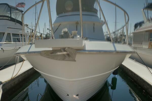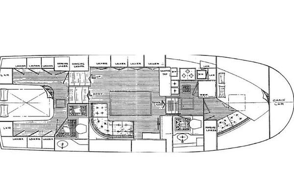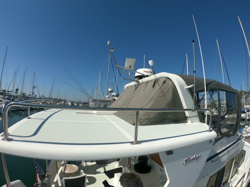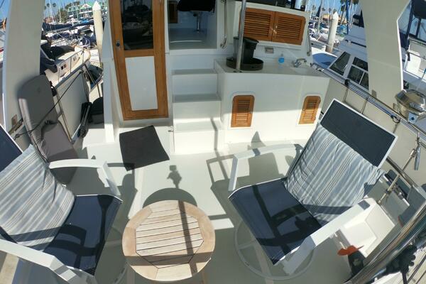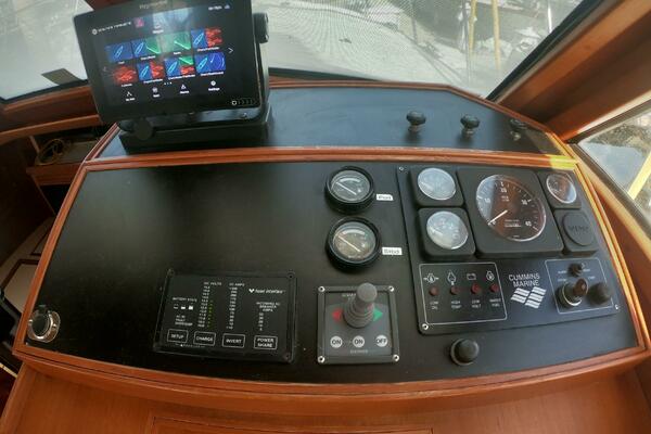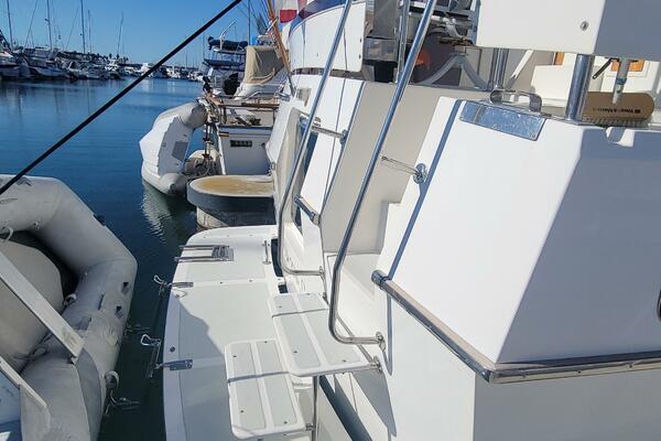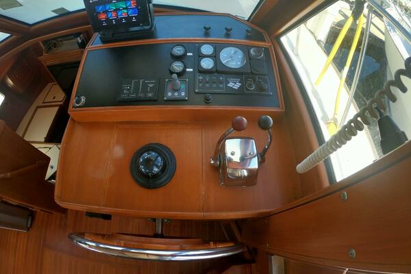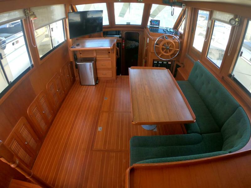 Moving up to the flybridge the helm is found center forward and features a captain's seat. A large L shaped settee runs along the starboard side and wraps around the back of the bridge, with a second lounge settee found on the port side. Along the back, the bridge is open to the sundeck below and the tender deck above, providing excellent 360 degree visibility. The fly bridge is protected from the elements by a Newer full clear hard windows, Makrolon, Bimini top with Full Enclosure.