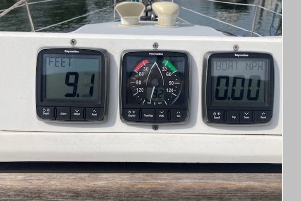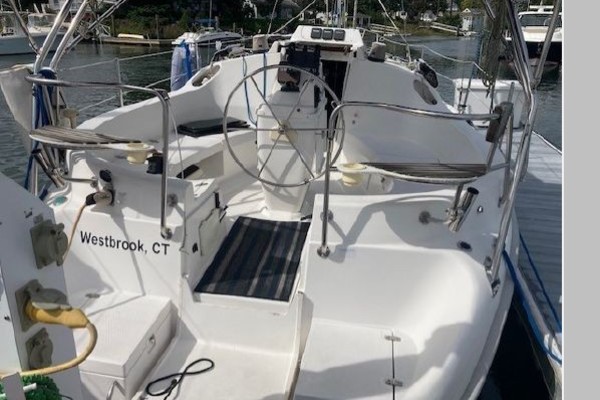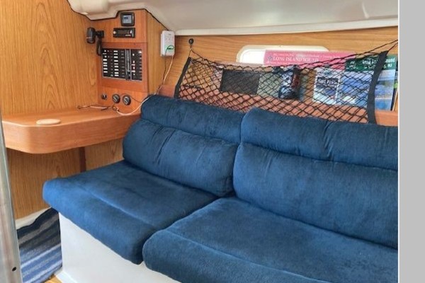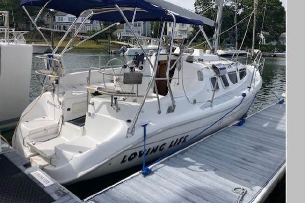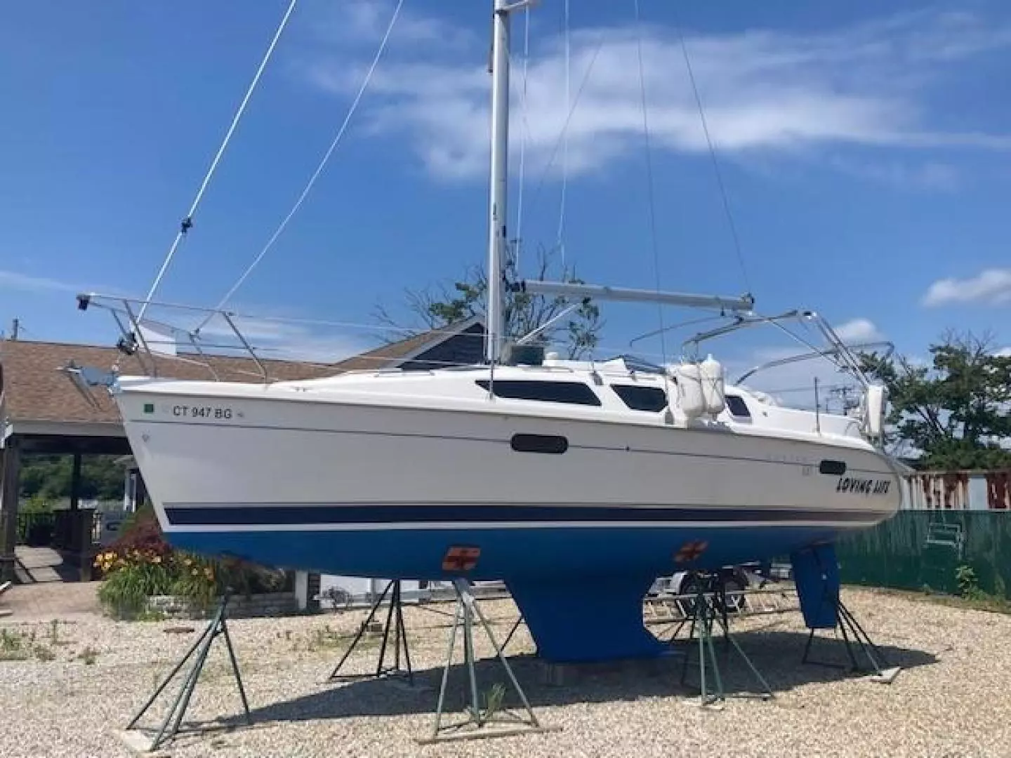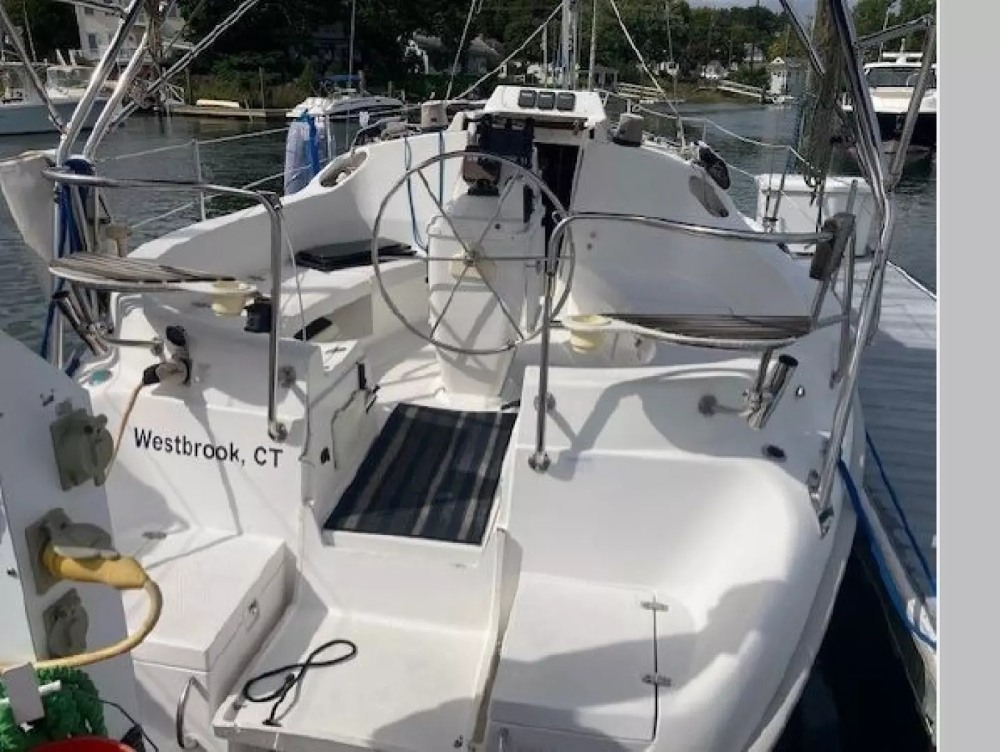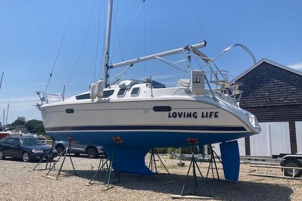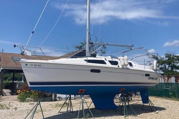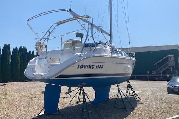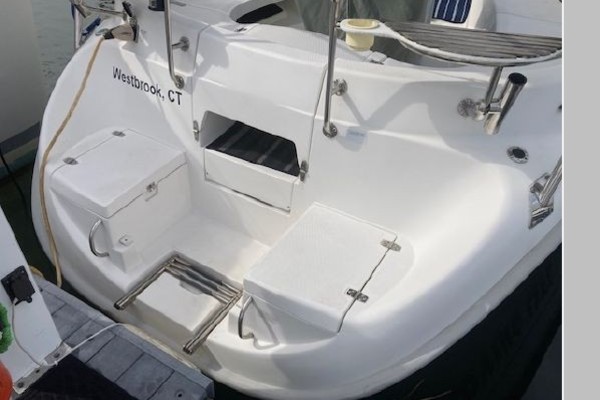 The Hunter 320 offers an easily handled sail plan, strong sailing performance, an integrated swim platform, walk-through transom, and a bright and airy air-conditioned interior with a private aft stateroom. Equipped with a wing keel, both a furling mainsail and genoa, Garmin GPS, and Raymarine wind instrument, knot log, and depth finder. Powered by an 18hp Yanmar diesel.