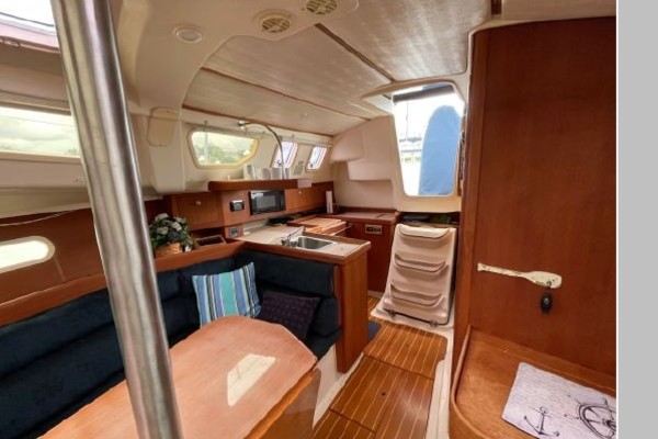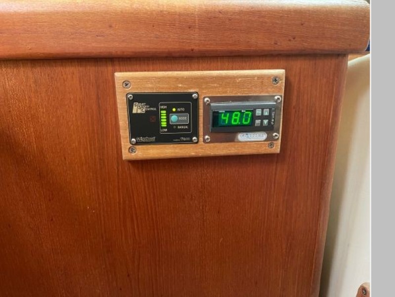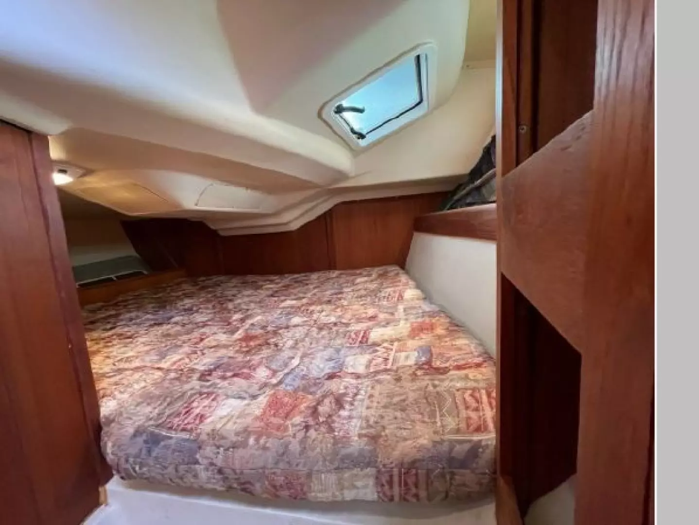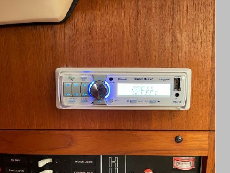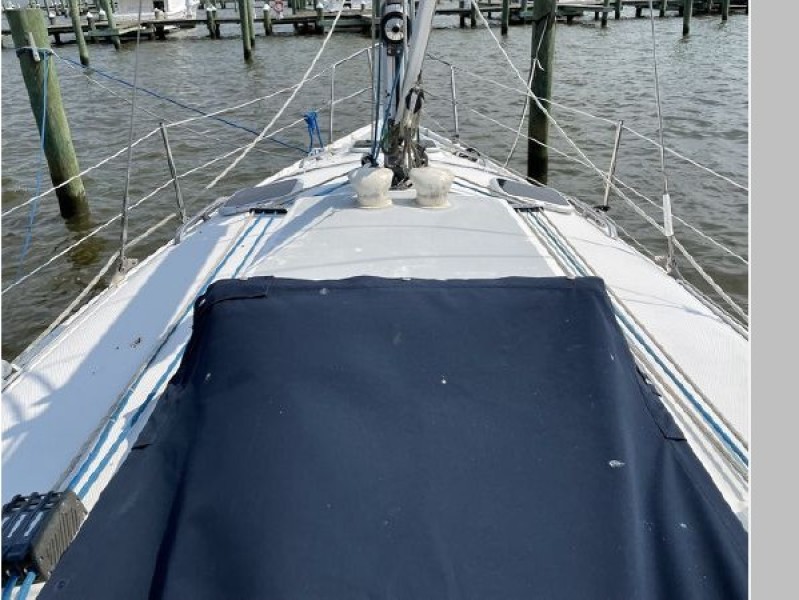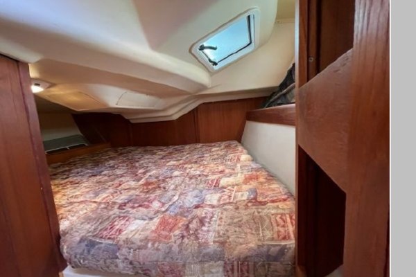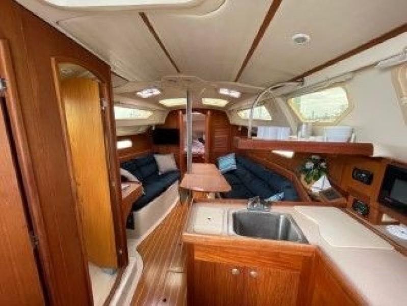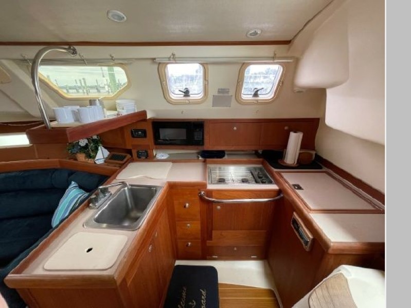 Starting forward, she has a private cabin that sleeps 2 and a hanging locker. Next is the main salon with a settee to port followed by a navigation station. To starboard is an L-shaped dinette. Aft of the dinette is a wonderfully large U-shaped sea galley. Across from the galley to port is the enclose head and directly aft is the access to the master stateroom with large double berth and hanging locker. She has lots of light and many opening ports and hatches for good ventilation. The teak cabinetry and teak and holly sole add warmth along with her dark blue cushions in the salon. Centerline companionway leads to her comfortable cockpit and is also access to the engine. All lines are lead aft through Jam cleats to the cockpit for ease in single handing.