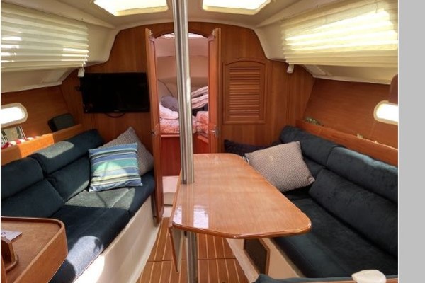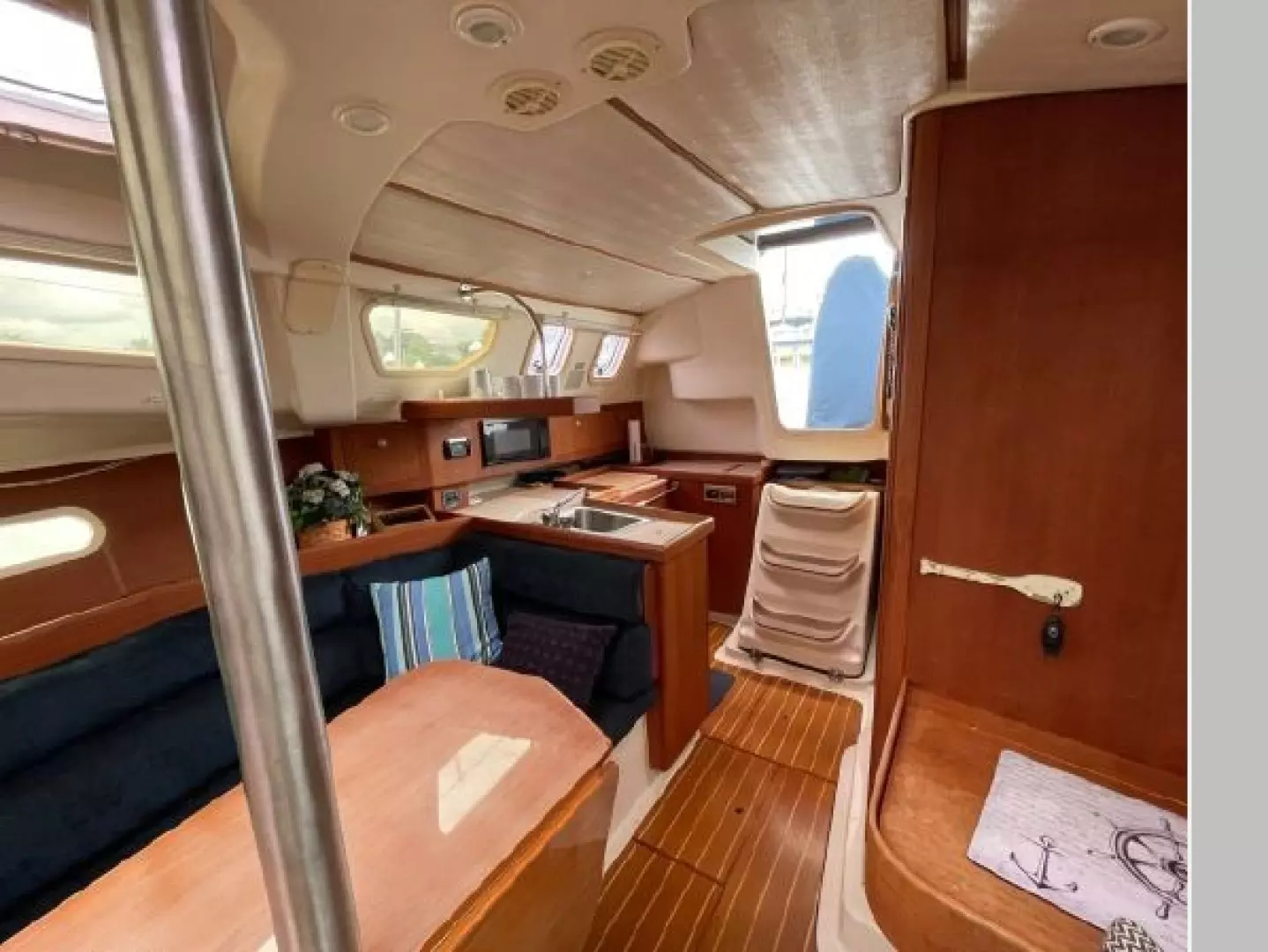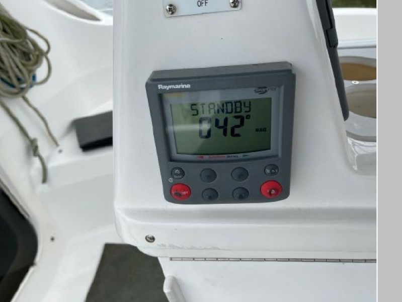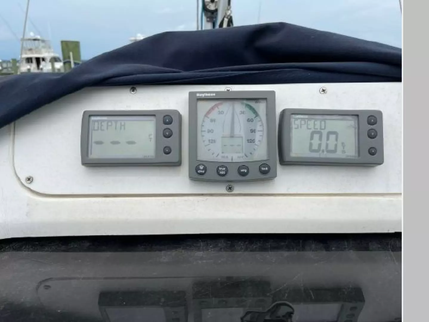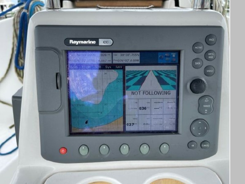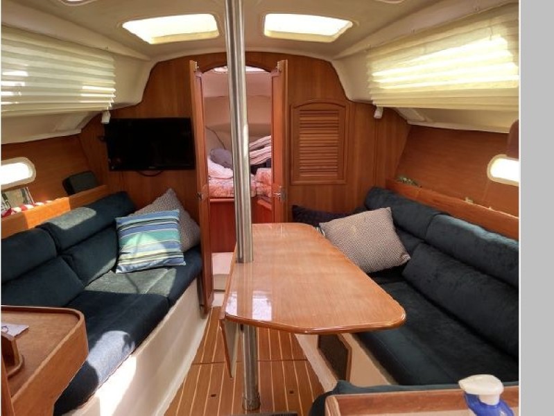 Starting forward, she has a private cabin that sleeps 2 and a hanging locker. Next is the main salon with a settee to port followed by a navigation station. To starboard is an L-shaped dinette. Aft of the dinette is a wonderfully large U-shaped sea galley. Across from the galley to port is the enclose head and directly aft is the access to the master stateroom with large double berth and hanging locker. She has lots of light and many opening ports and hatches for good ventilation. The teak cabinetry and teak and holly sole add warmth along with her dark blue cushions in the salon. Centerline companionway leads to her comfortable cockpit and is also access to the engine. All lines are lead aft through Jam cleats to the cockpit for ease in single handing.