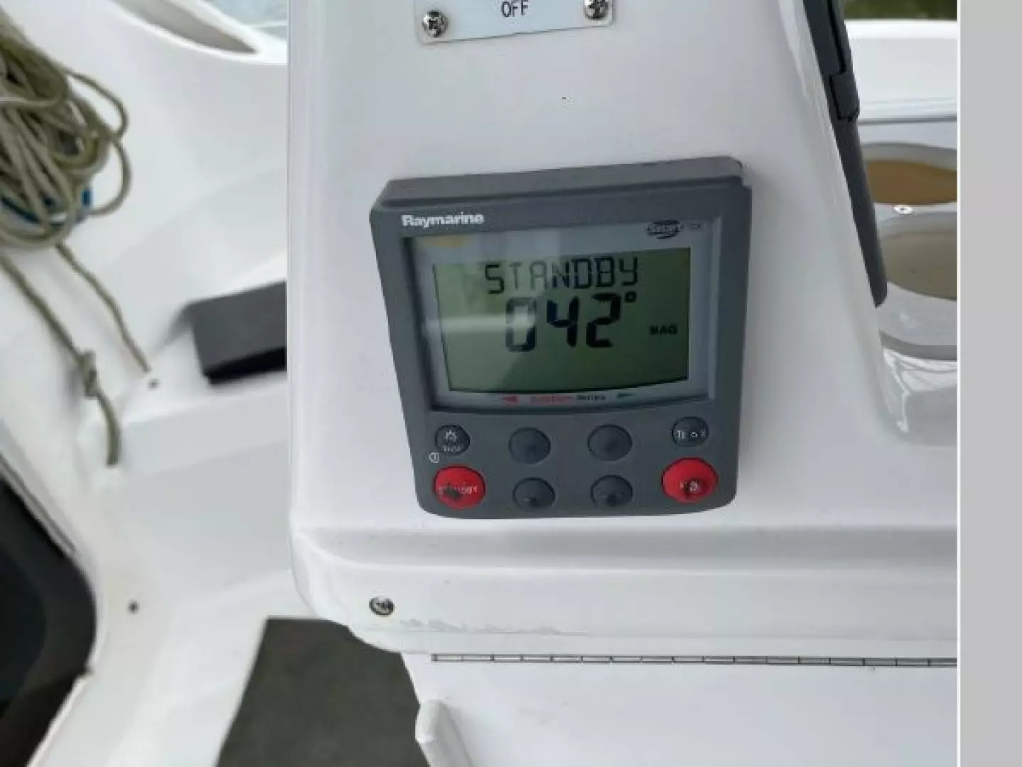 She offers a generous cockpit with 2 stern rail seats, cockpit table attached to the pedestal with instruments and engine controls. The helm seat hinges aft, leading onto the walk-through transom with a retractable swim ladder and cockpit shower. Above the cockpit is the stainless steel arch which serves as an attachment point for both the mainsheet as well as the bimini. This keeps the cockpit clear and uncluttered.