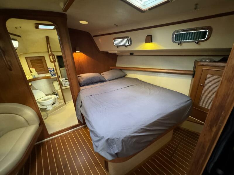 - Owner’s stateroom forward with island berth, ensuite head, and separate stall shower