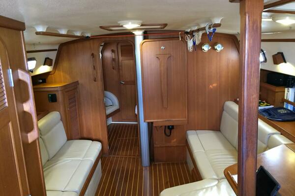 The Island Packet 420 offers a luxurious, well-appointed interior finished in solid teak and cream laminate accents, with excellent ventilation and light throughout.
