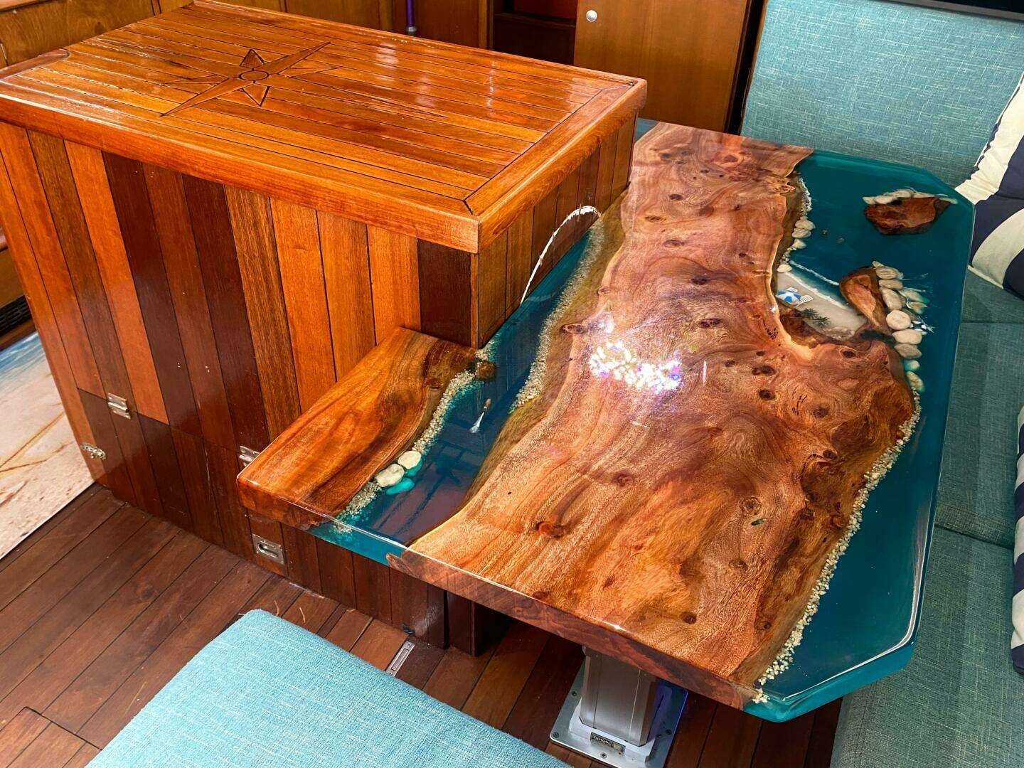 Inside, the saloon features a new electric table with a custom 3D coastline design that converts into a spacious berth, alongside a central fridge-freezer worktop. The refit included full air-conditioning throughout, a huge forward owner’s suite transformed from two bow cabins, and two spacious aft queen-bed cabins—space personified.