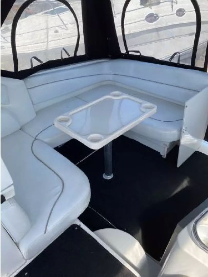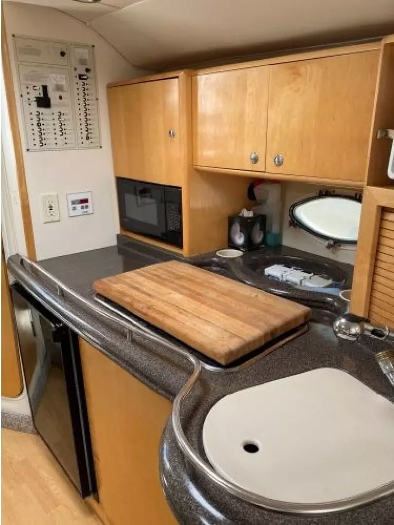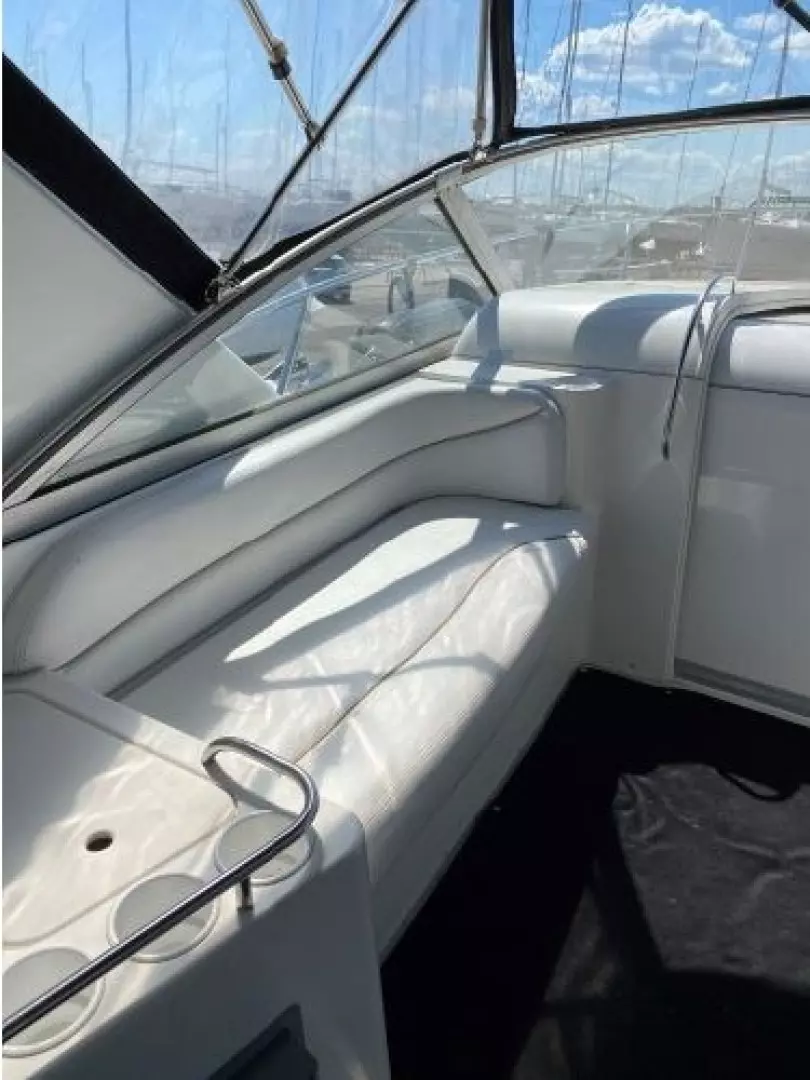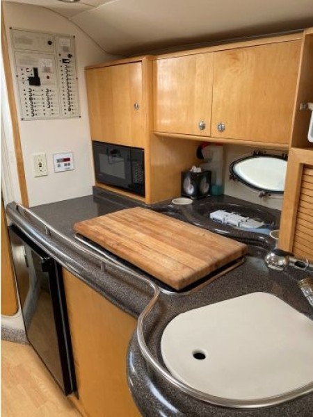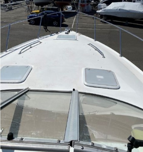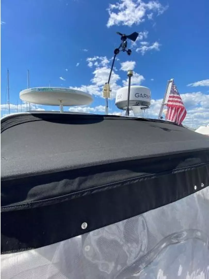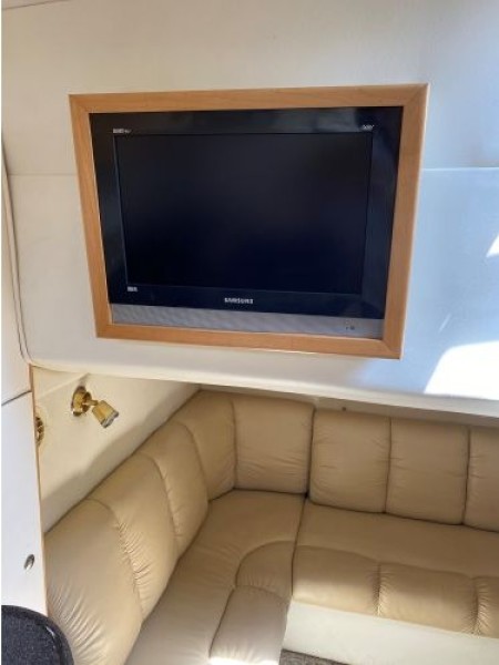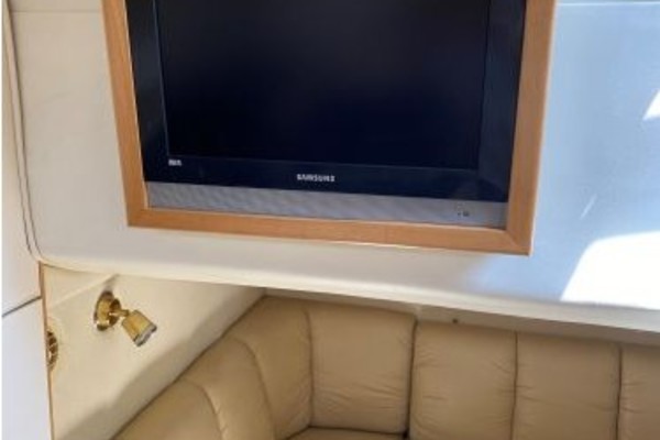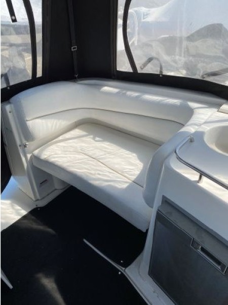 This fun, comfortable boat is stable and spacious. Roomy cockpit with full enclosure and new canvas with screens, refrigerator and sink make entertaining easy no matter the weather. Luxurious features below include double berth forward, mid-cabin berth and convertible dinette. Head includes stand-up shower and new stainless fixtures. Galley, flat screen TV and 250-watt stereo system add to the entertaining possibilities. Extended swim platform is another great bonus.