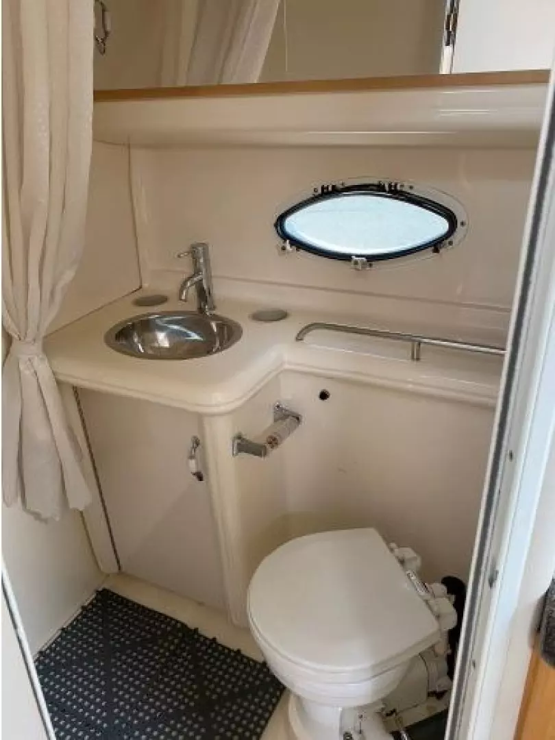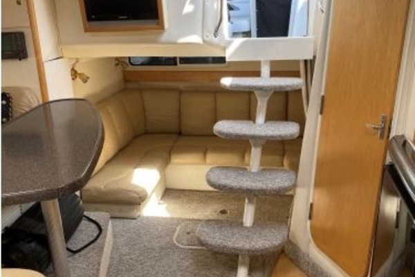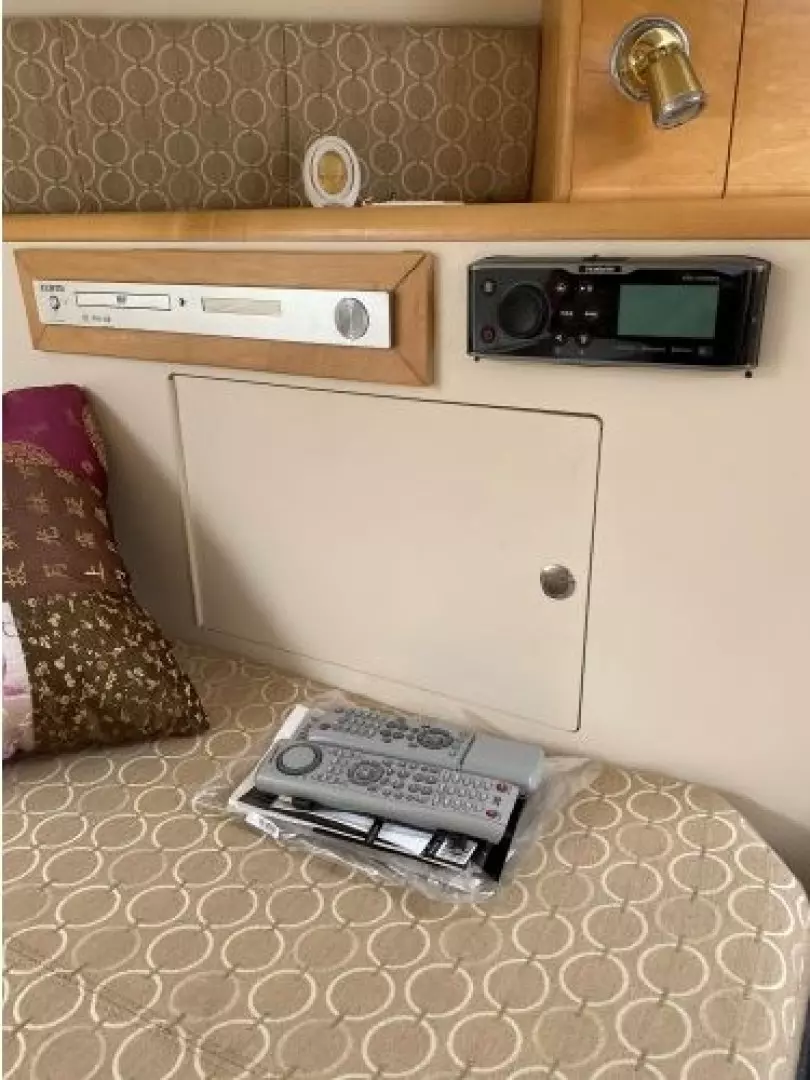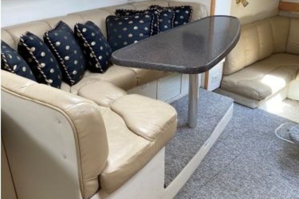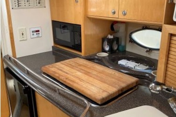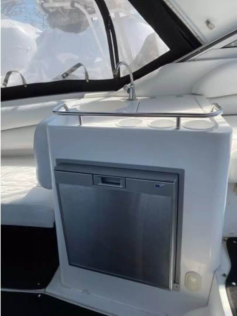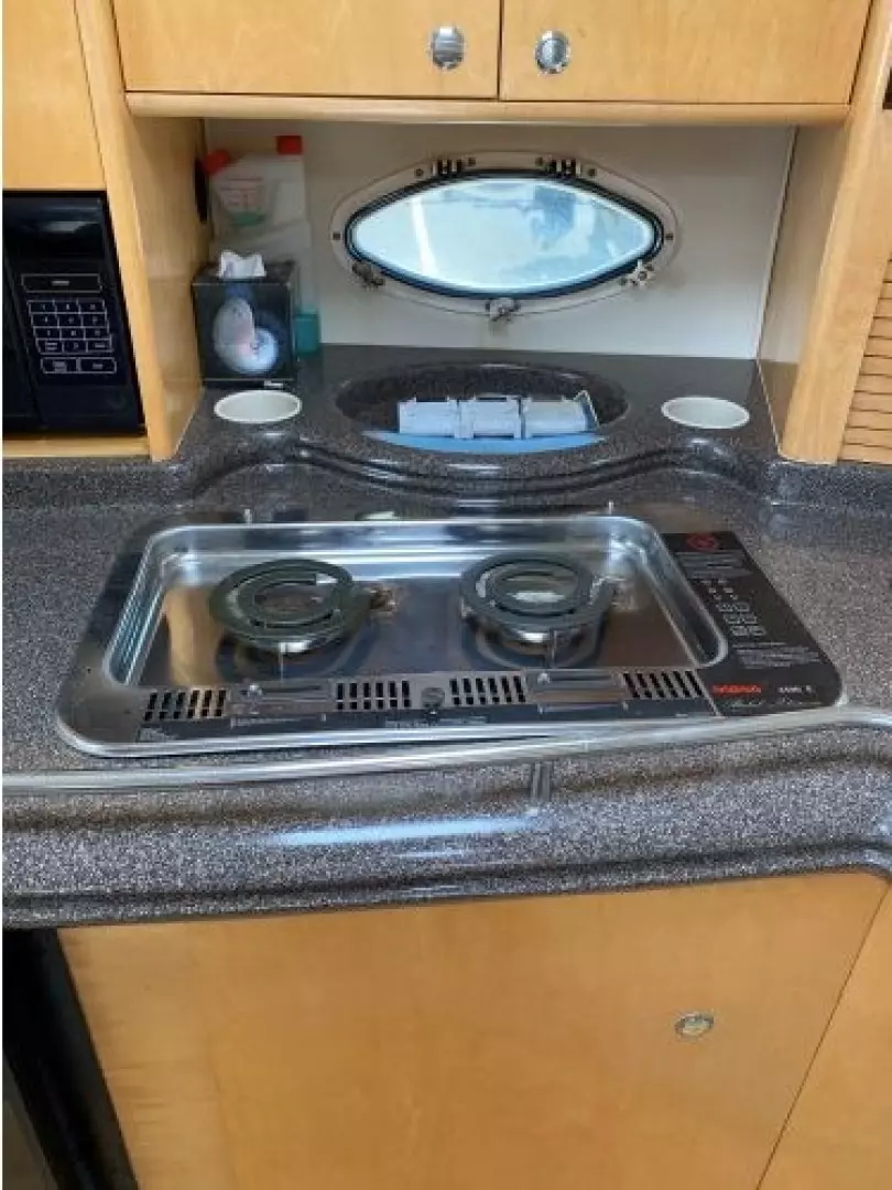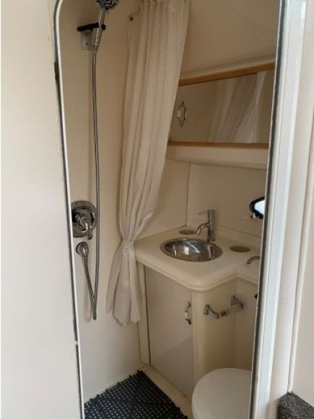 This fun, comfortable boat is stable and spacious. Roomy cockpit with full enclosure and new canvas with screens, refrigerator and sink make entertaining easy no matter the weather. Luxurious features below include double berth forward, mid-cabin berth and convertible dinette. Head includes stand-up shower and new stainless fixtures. Galley, flat screen TV and 250-watt stereo system add to the entertaining possibilities. Extended swim platform is another great bonus.