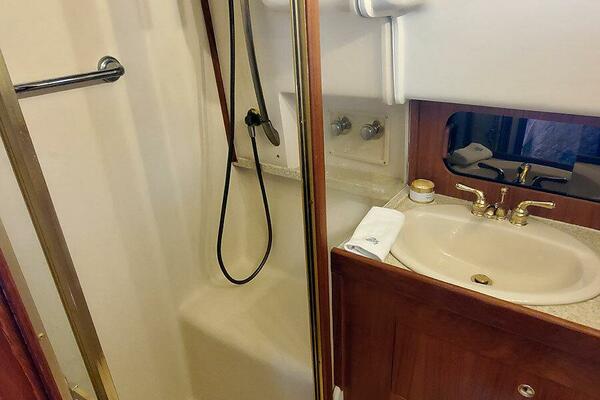 Below deck, the interior offers an inviting and practical layout. The full-beam master stateroom aft features an island queen berth and private ensuite head with shower, while the forward guest stateroom provides a comfortable V-berth. The guest head with separate shower is just aft to starboard of the guest stateroom.