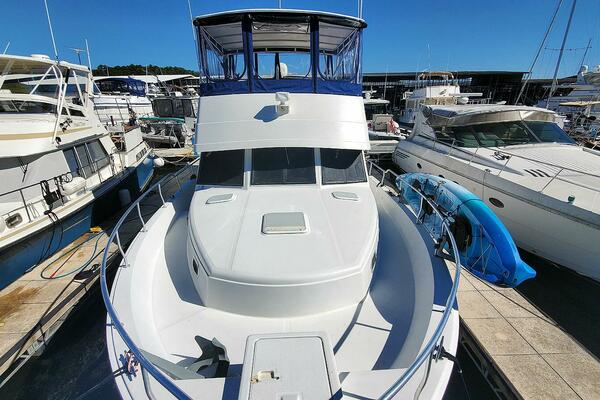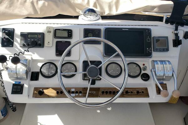 Highlights include a spacious flybridge and sundeck, both protected by hardtops with full Strataglass enclosures, and an Raymarine electronics suite that enhances both navigation and confidence underway.