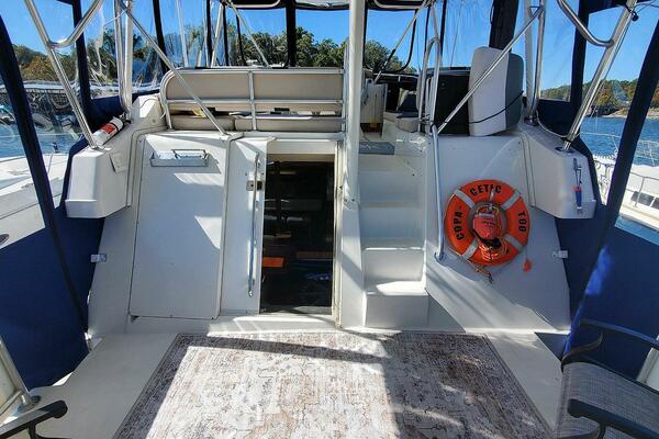 Sliding doors on both port and starboard sides offer easy access to the wide side decks. From the salon, you can conveniently reach the master stateroom and sundeck aft, as well as the galley, engine room companionway, guest head, and guest stateroom forward.