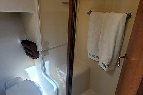 The guest head, located to starboard just aft of the stateroom and across from the galley, includes a vanity with porcelain sink, Vacuflush toilet, storage cabinet and drawers, portlight and a separate shower enclosure, combining privacy and practicality for guests.