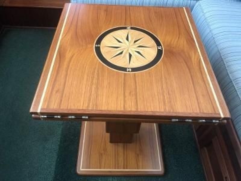 Moving aft and down a few steps is the salon and dining area to starboard with the galley to port. The salon features a beautiful custom Arrigoni high/low table cocktail/dining table. There is ample seating on a large convertible settee and aft is an entertainment center with a 17" flat screen TV, DVD player, Sirius satellite radio and four (4) speakers. The full function galley runs along the port side and features a large counter area and ample storage. Aft and up leads to the fantail cockpit with room for directors chairs and lounging.