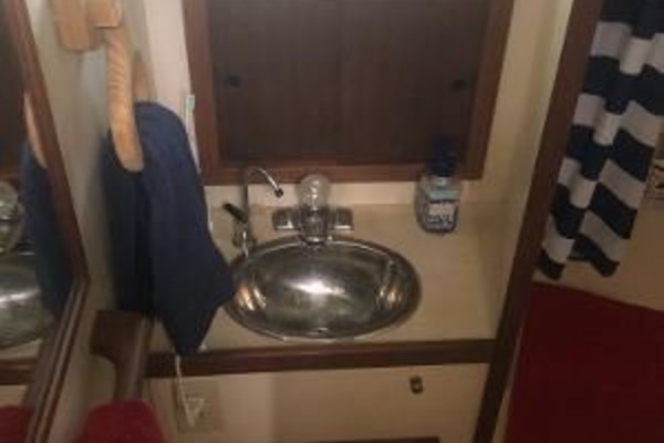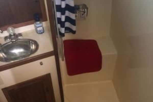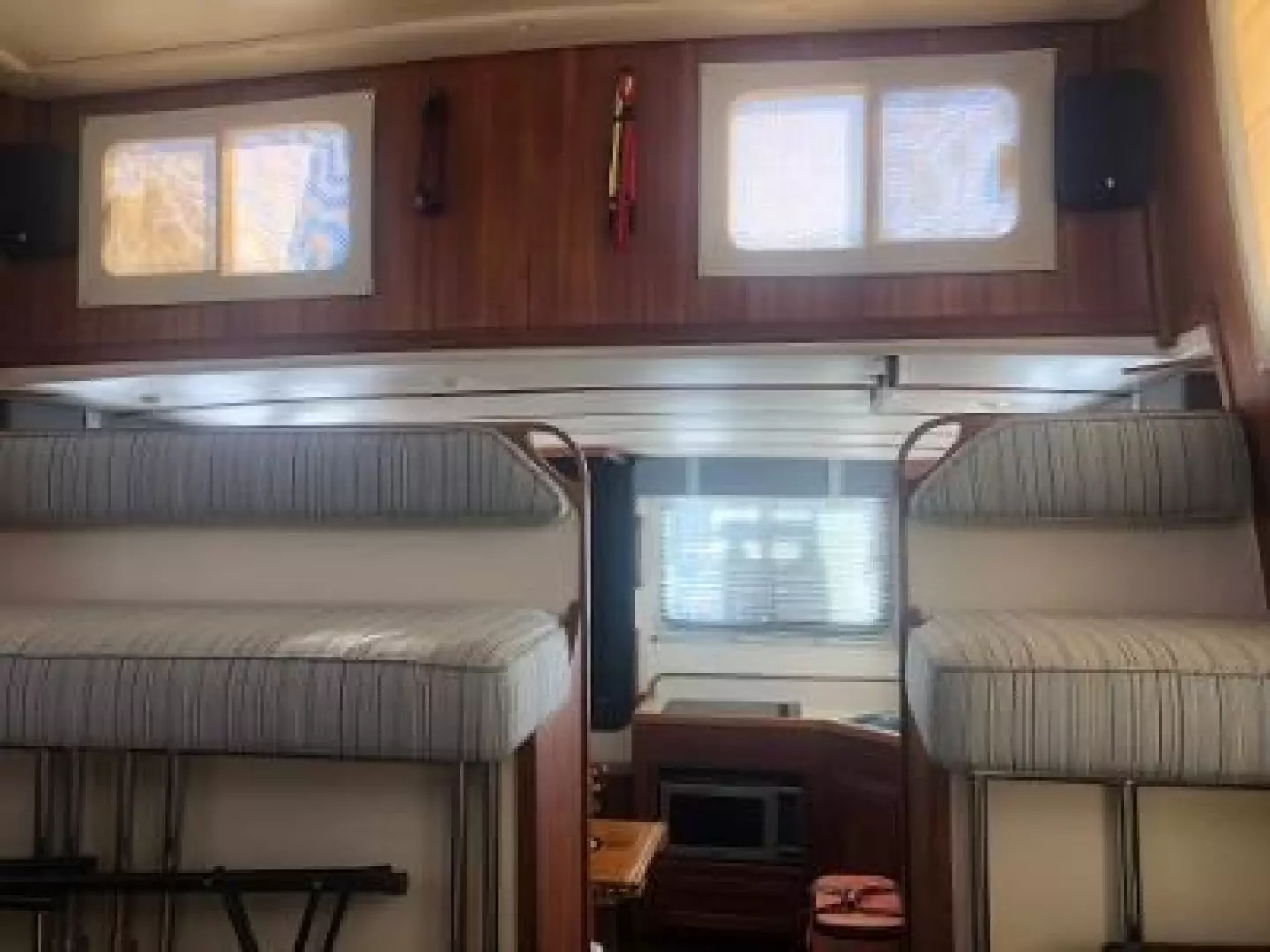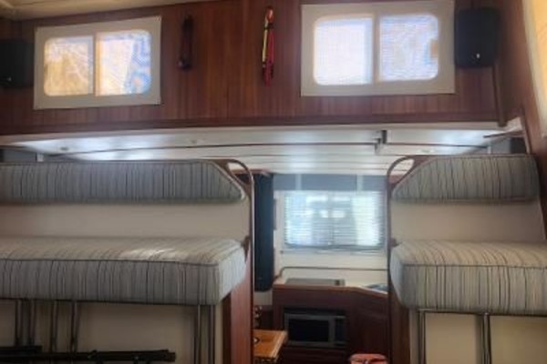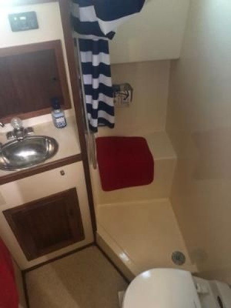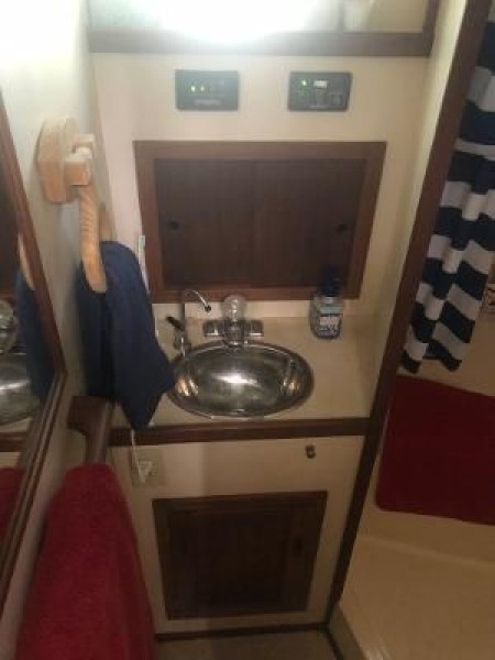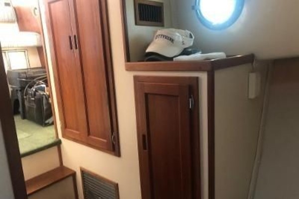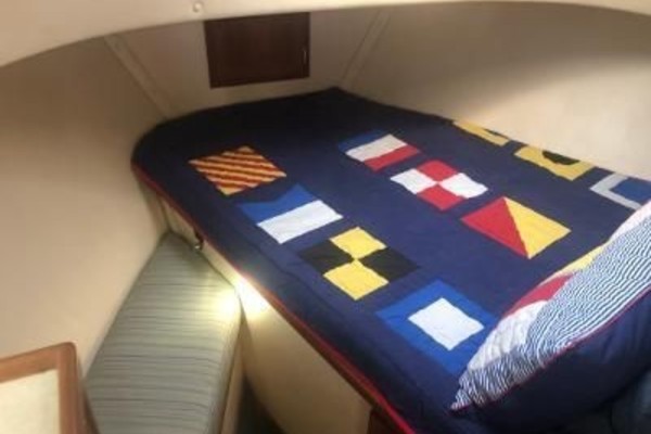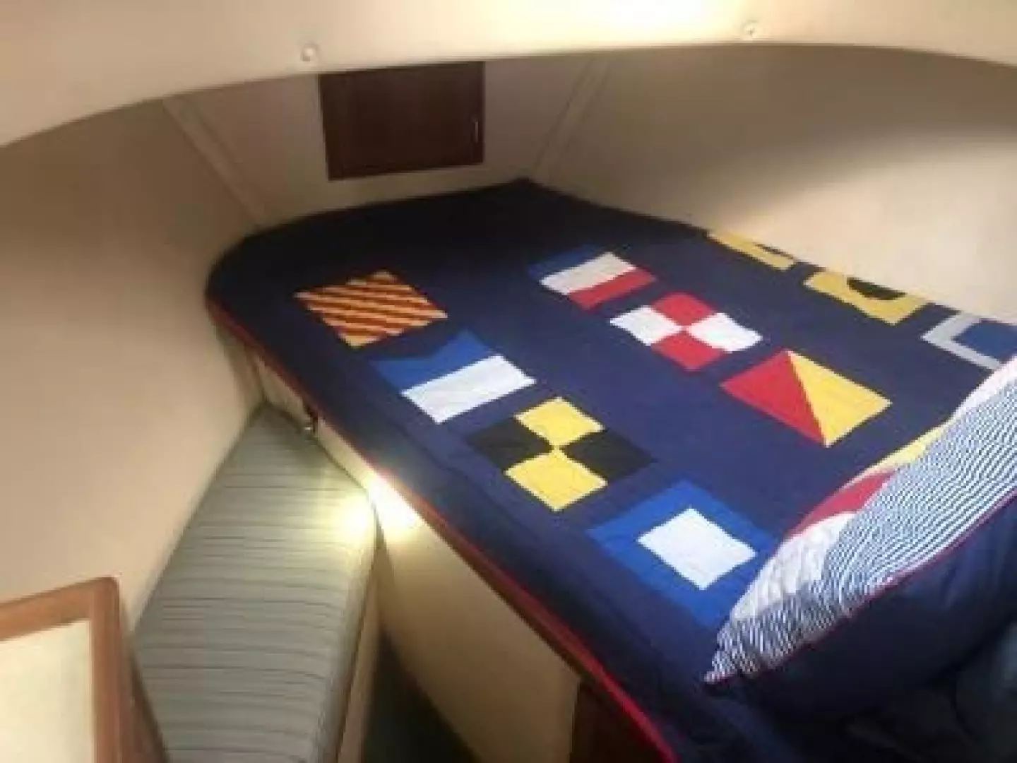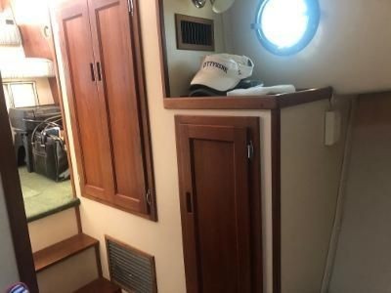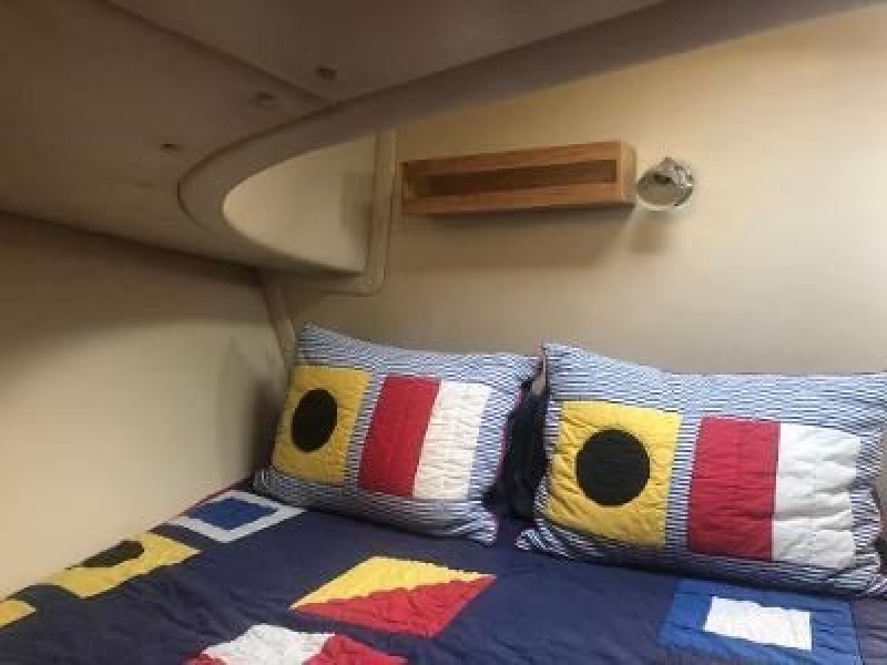 The master stateroom is down and forward of the helm and features a large size berth to starboard and a long settee to port. The private head is adjoining. There are plentiful storage drawers, cabinet, hanging closet, reading lights,12v outlets, and an overhead hatch w/screen.