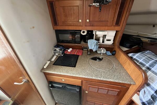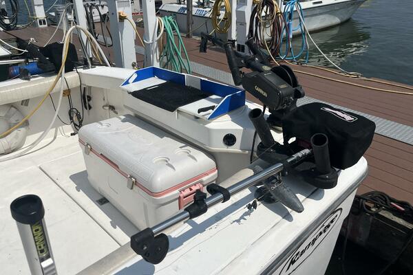 The spacious cockpit is designed for serious anglers: equipped with a 38-gallon transom livewell, large in-deck fish box, tackle center, and a self-bailing layout all designed to streamline your fishing routines. Below, find a warm cherrywood-accented cabin with sleeping for four—a forward V-berth and salon settee that converts into additional berths. The galley is complete with refrigerator, Stove top, cofee maker and microwave. The enclosed head includes a standing shower for daytime or overnight comfort.