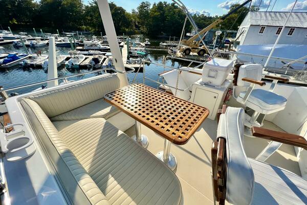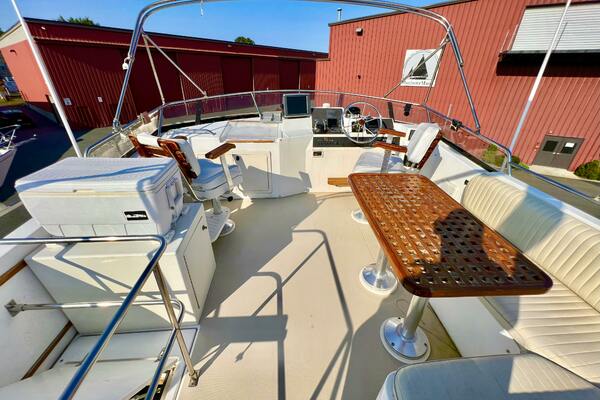 Exterior spaces include the aft deck, full walkaround side decks, bow area and flybridge. The flybridge is perfect to sit and have a beverage with your friends, a romantic dinner with a spouse or just to sit and take it all in! There is a helm station on the flybridge to steer the yacht from as well as a “co-pilot” seat. There is a teak table and L-Shaped settee which can easily seat four people.