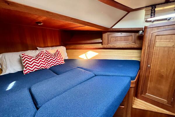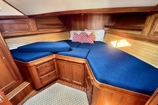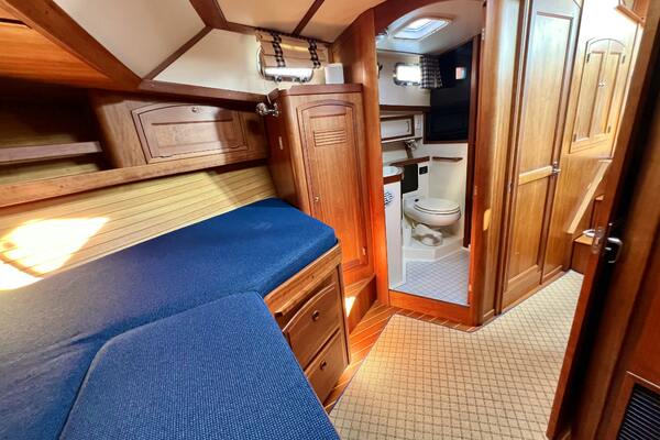 Forward from there is the VIP stateroom and guest head. This stateroom has a large V-Berth with insert, ample drawer & locker storage throughout, two large hanging lockers and ventilation with opening porthole windows and a hatch above the berth.