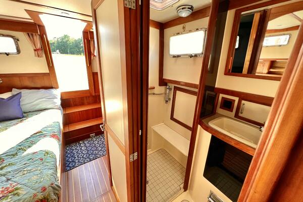 The guest head offers a separate shower space and a door to the hall offering it up as either a private en-suite head or a spacious day head.Aft and down a few small steps is the Master Stateroom and Master Head. This impressive full beam layout allows for a walkaround standard Queen berth and generous storage throughout the cabin. The private master head also has a separate shower space and again, lots of storage for full liveaboard capabilities. A companionway door with watertight hatch opens up to the aft deck.