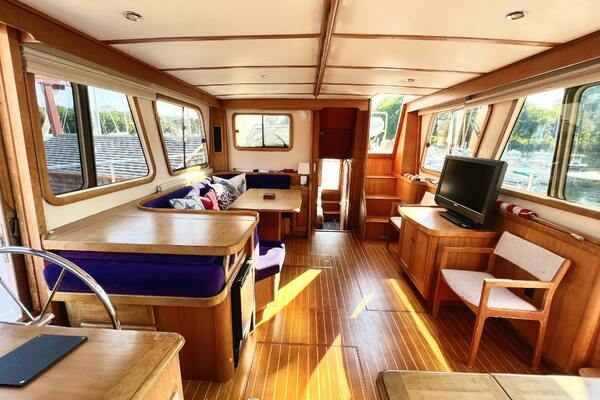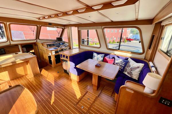 The bright and open salon features the interior helm station to starboard, helm seat which can fold down to act as a table. Sliding doors on port and starboard provide quick access to the full walkaround side decks. Forward to port is the desk/chart table. Comfortable U shaped settee with adjustable table with folding leaves