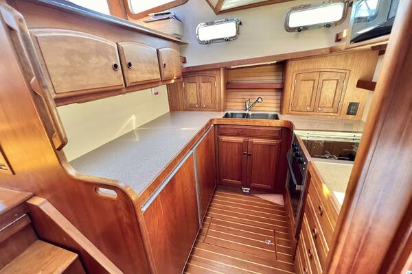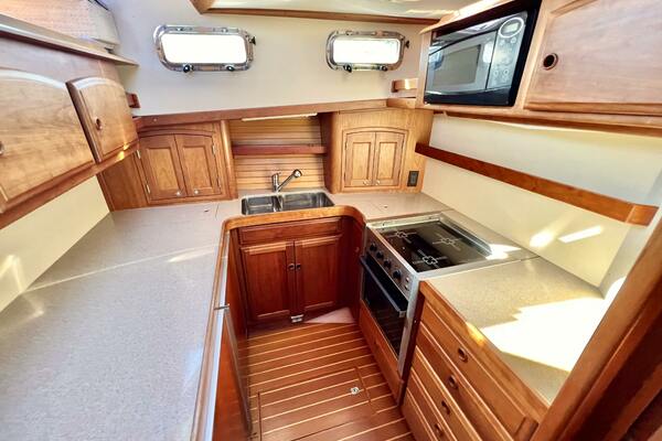 Moving forward and down a few steps, you have your galley that is open air to the salon and the ample light that the forward dash window provides.
