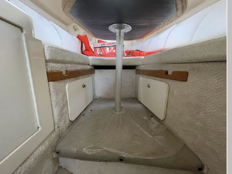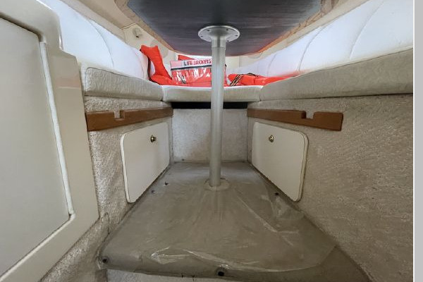 Comfortable main salon with forward dinette that converts to a V-berth. Color coordinated upholstery, hanging locker, mirrored rope locker, shelving outboard of dinette, storage compartments, overhead lights.