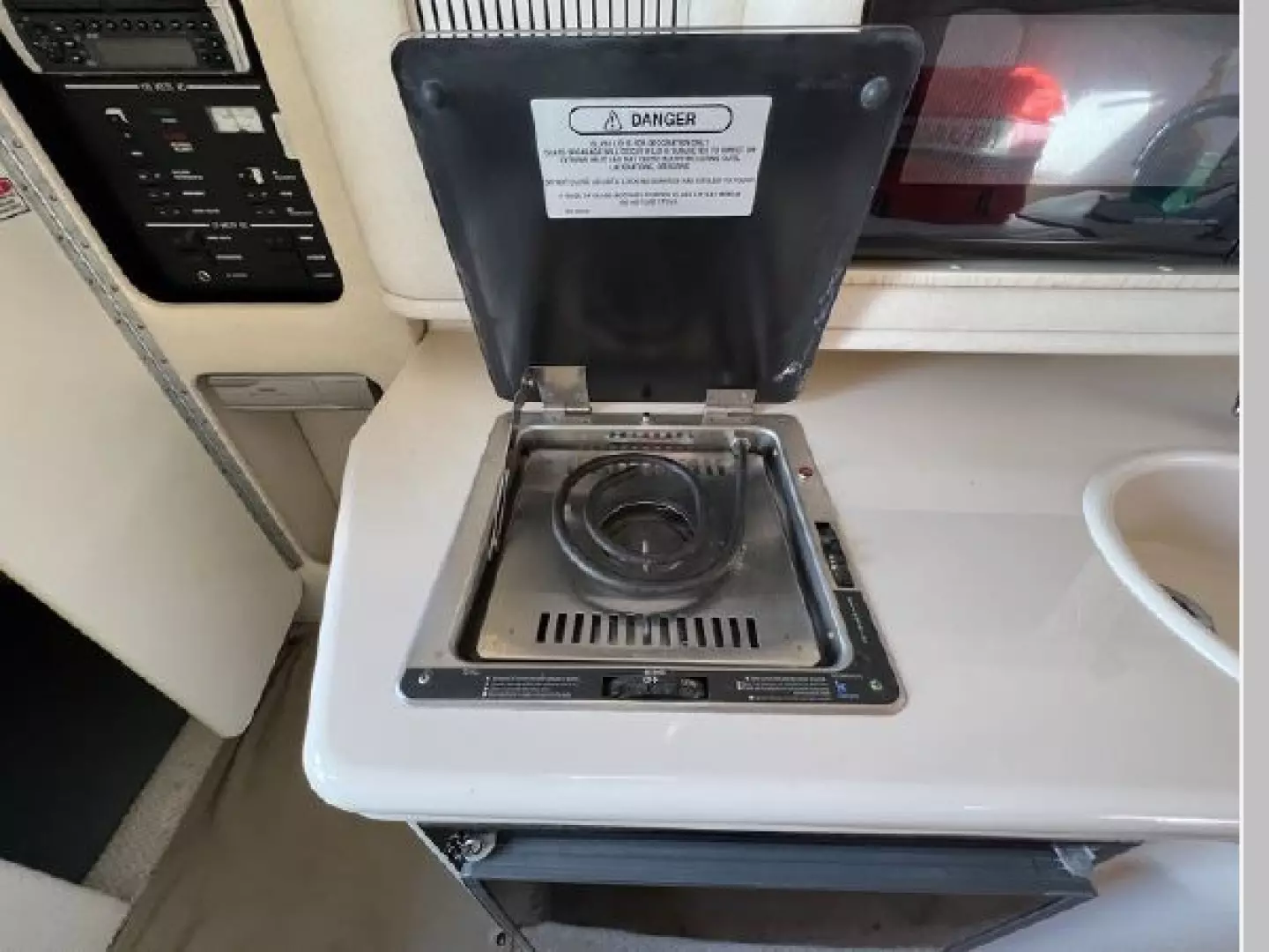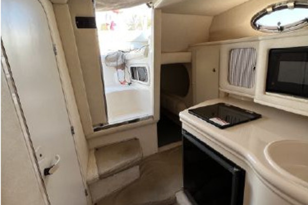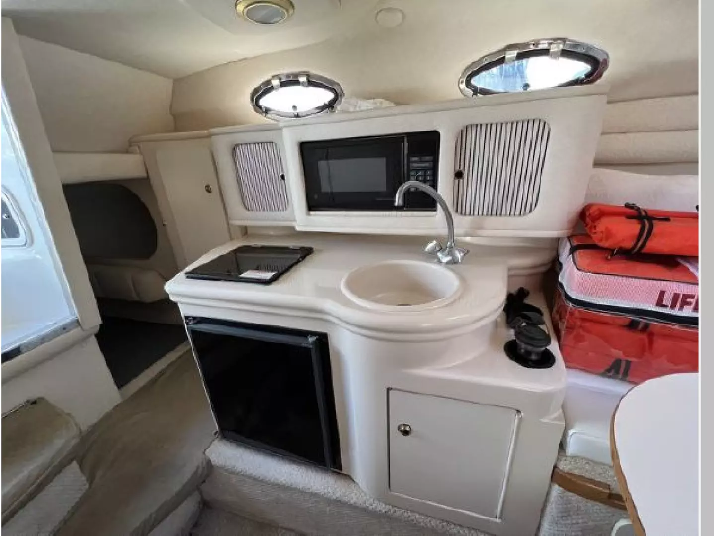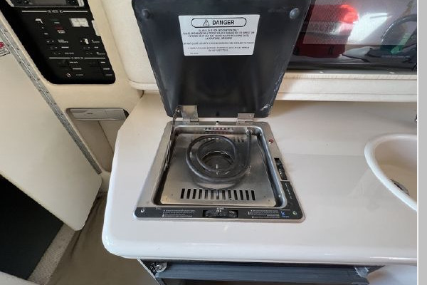 The galley is well appointed for a boat of this size. There is plenty of counter and cabinet space for food prep and comes equipped with;