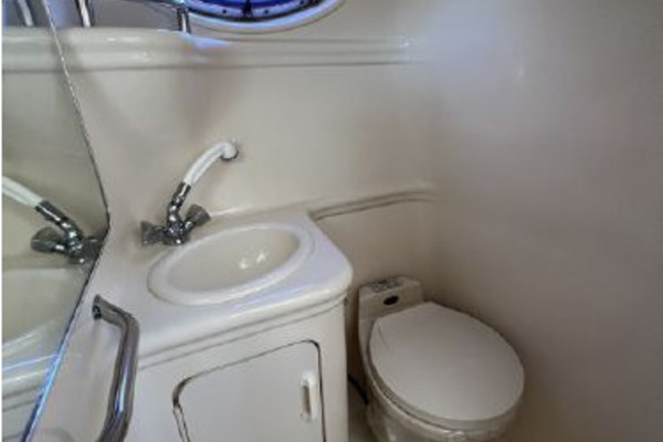 Next to starboard is the private enclosed head with locking door, Vacuflush marine toilet, macerator, holding tank, sink and shower with hot and cold pressure water, mirror, stainless steel hand rail, storage compartments and overhead light.