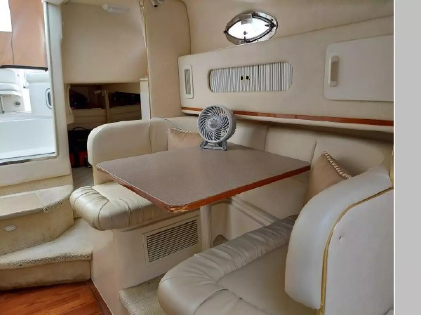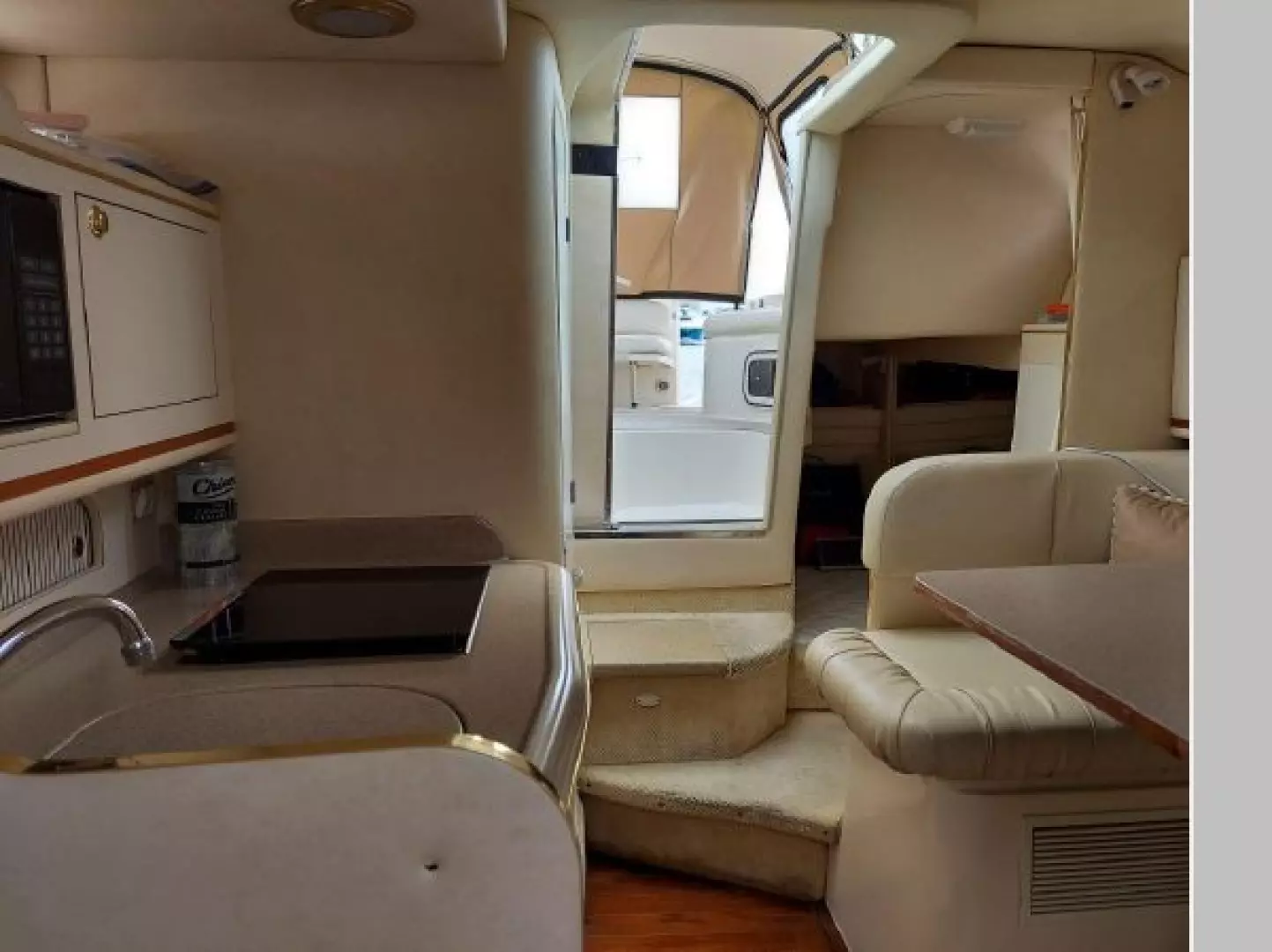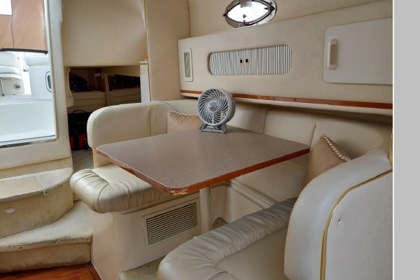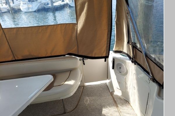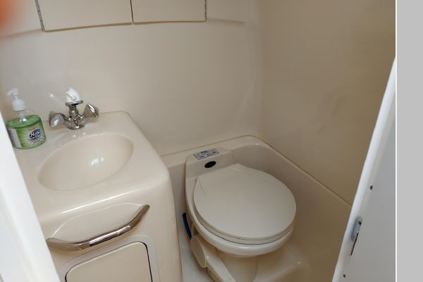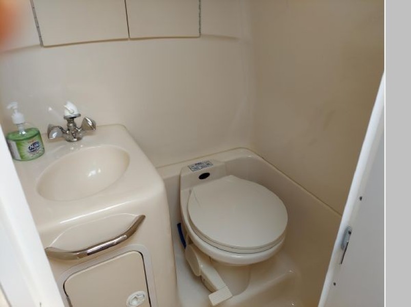 The V-berth is forward followed aft to port by the dinette area and aft to starboard is the spacious galley area. Aft to starboard is the enclosed head with sink, vanity and shower. Aft to port is the entrance to the aft cabin. Up a couple of steps to the helm deck with the helm to starboard and a lounge seat to port. Aft again to the cockpit area and out the transom door to the swim platform.