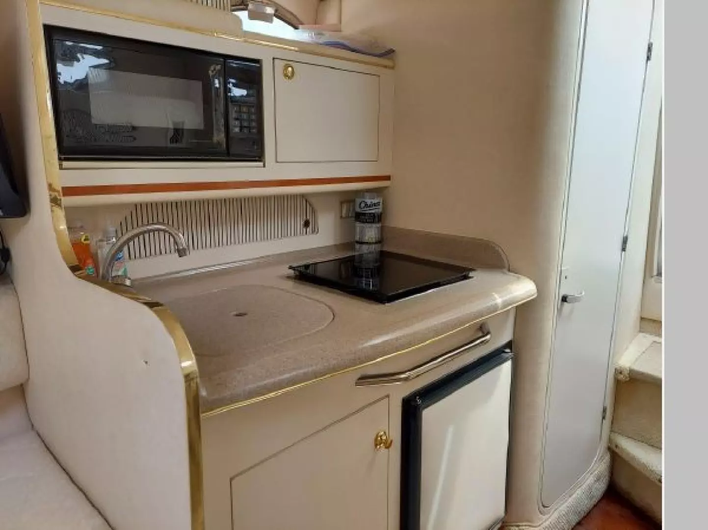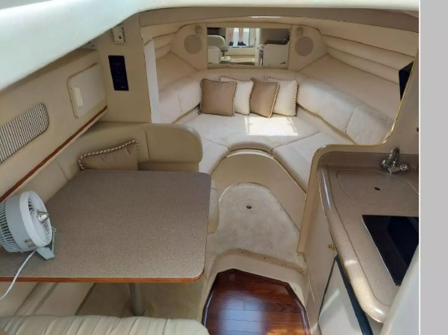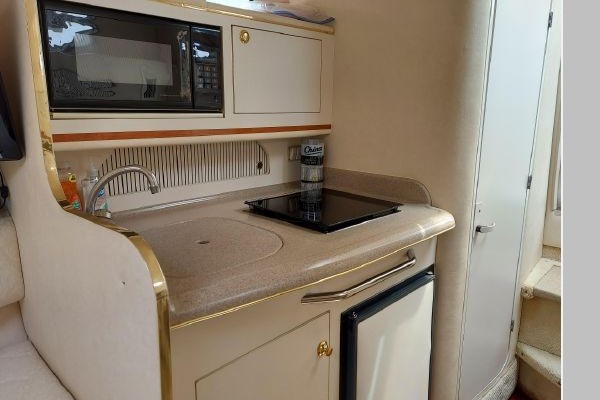 The V-berth is forward followed aft to port by the dinette area and aft to starboard is the spacious galley area. Aft to starboard is the enclosed head with sink, vanity and shower. Aft to port is the entrance to the aft cabin. Up a couple of steps to the helm deck with the helm to starboard and a lounge seat to port. Aft again to the cockpit area and out the transom door to the swim platform.