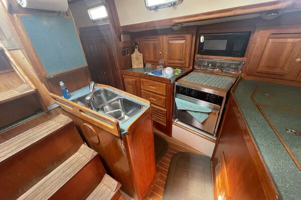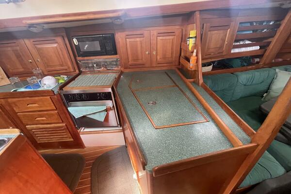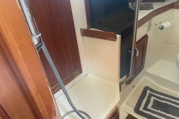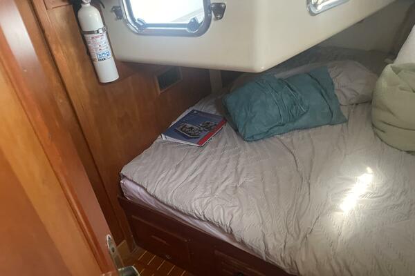 Forward cabin has a large comfortable V-Birth with under bunk storage. There is a vanity and sink to port and a large storage locker to starboard. The forward hatch and opening ports provide excellent ventilation . The large opening panel in the forward bulkhead provides airflow thru the entire boat.The U-shaped settee to port will accommodate your guests and can be converted to a double if needed.