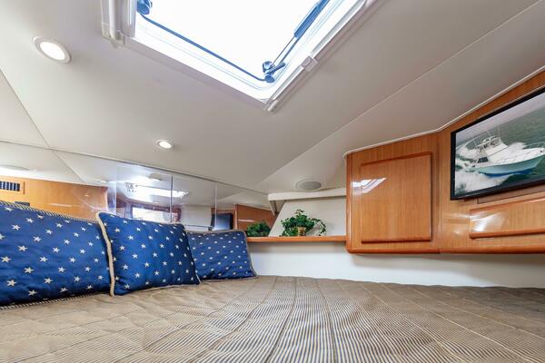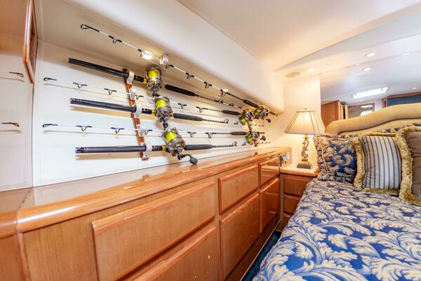 The bunk room is to port and continuing down the companionway is custom rod storage to port and an entrance to the guest head. The forward stateroom has a single full-sized bunk with ample storage and an access door to the guest head.