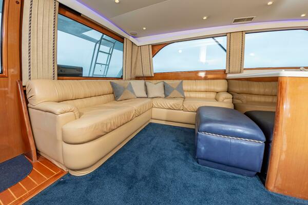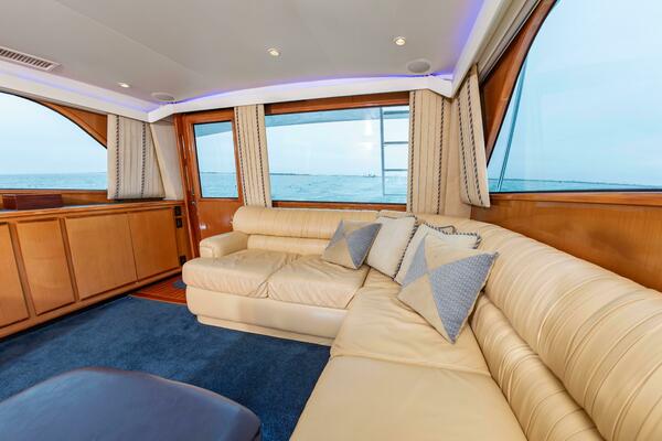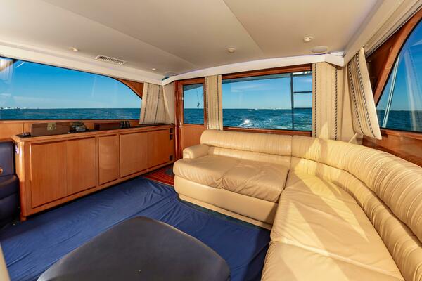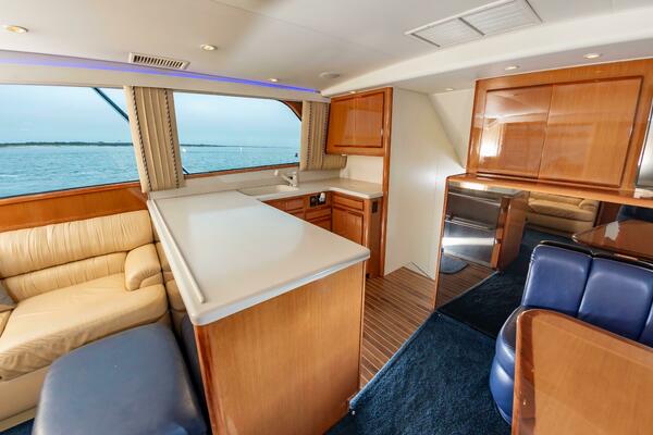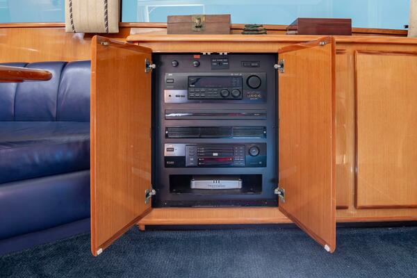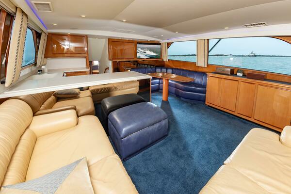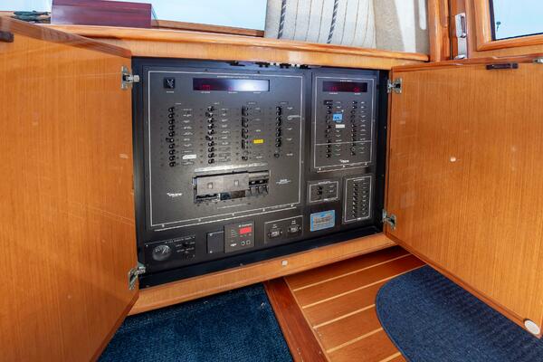 Entering the spacious salon through the starboard side door there is a large L shaped couch with storage underneath. To starboard is the covered breaker panel and storage with shelf under the windows leading the forward dinette. The galley is to port and has Corian counter tops, updated subzero drawer style refrigeration, large sink with storage below and cooktop under the forward cabinets. There are deep storage cabinets to the starboard of the companionway with a large flat screen TV mounted on an articulating arm and custom cabinetry behind.