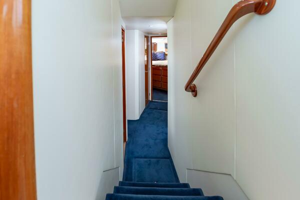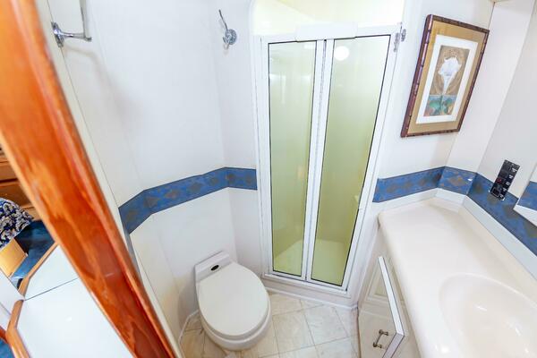 Stepping down the companionway stairs you find the primary stateroom with walk around queen bed and en-suite head to starboard.