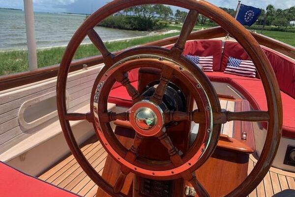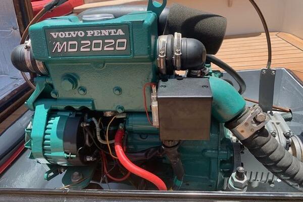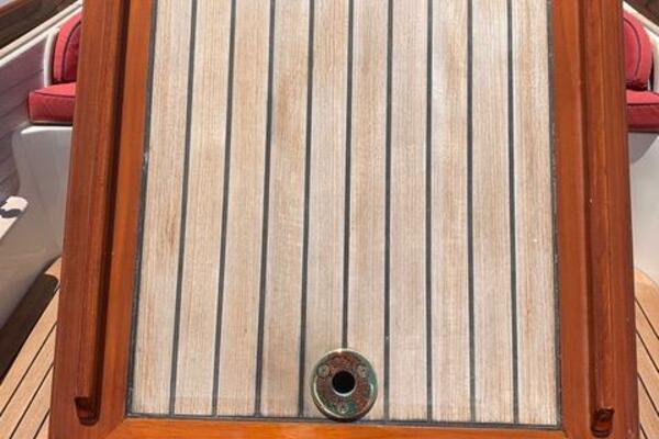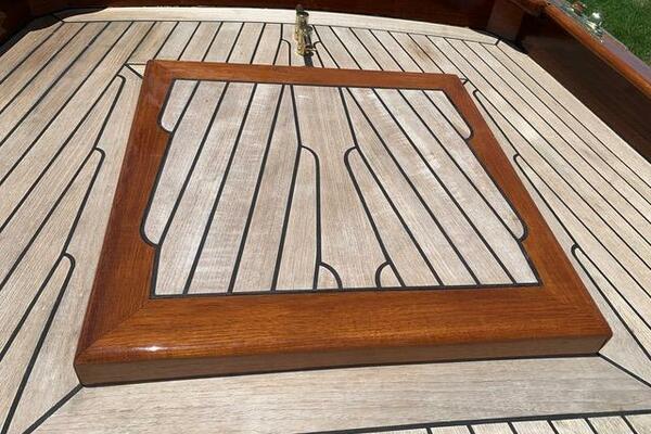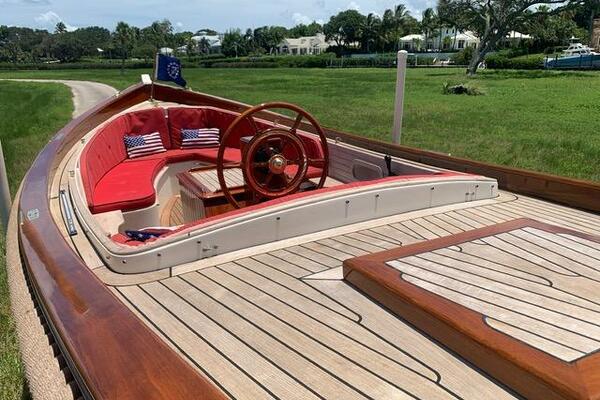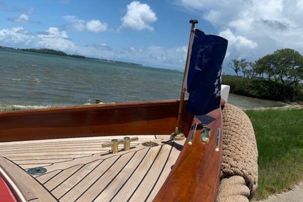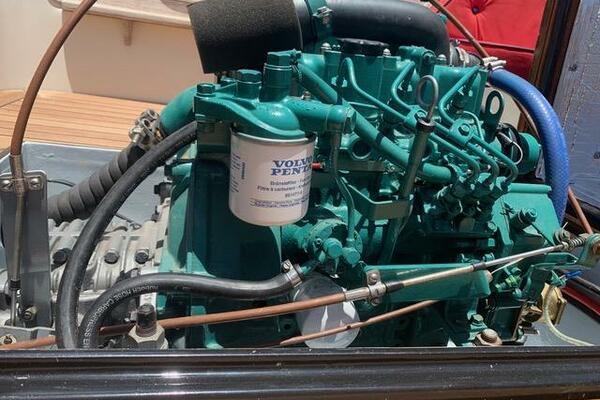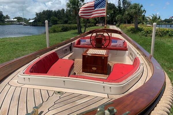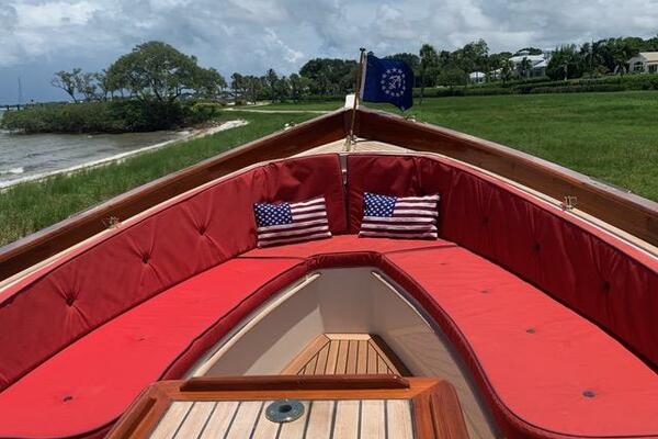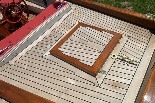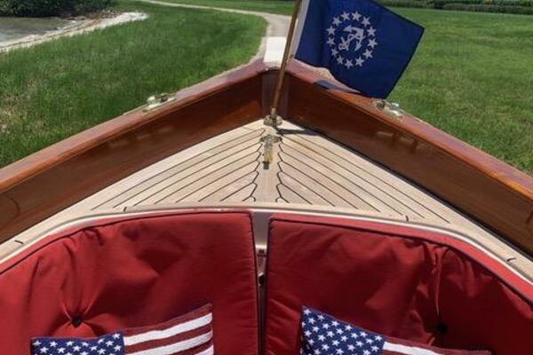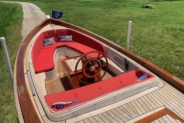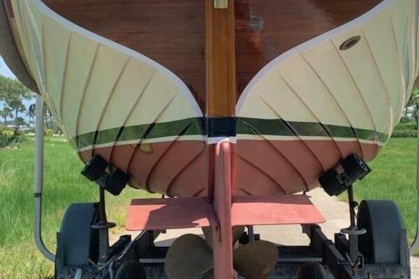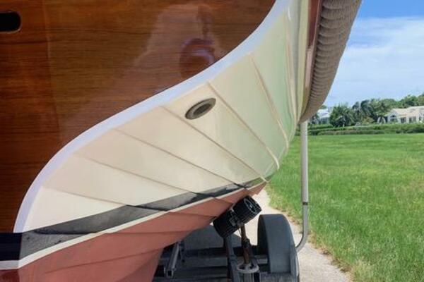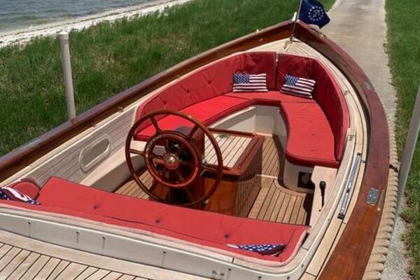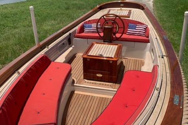 This like new 2001 has been completely and professionally overhauled from bow to stern. The 23 HP Volvo Penta diesel in-board engine (model #MD 2020) has zero hours with all new parts down to the block. The fuel tank has been meticulously cleaned, the 12-volt electrical system has been redone, and a new cutlass bearing has been installed. Additionally, all mahogany and teak gunwales and decks have been stripped and varnished to highlight their inherent beauty. The boat comes equipped with original canvas top and cockpit cushions, both of which are in excellent condition.