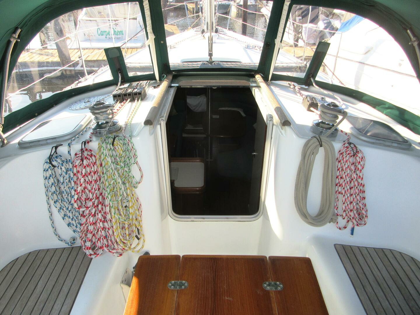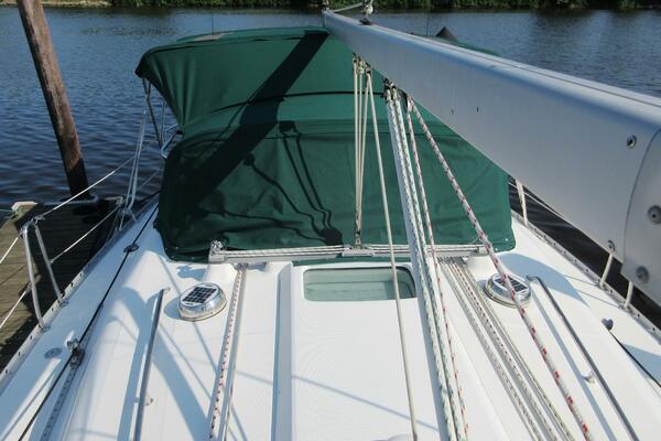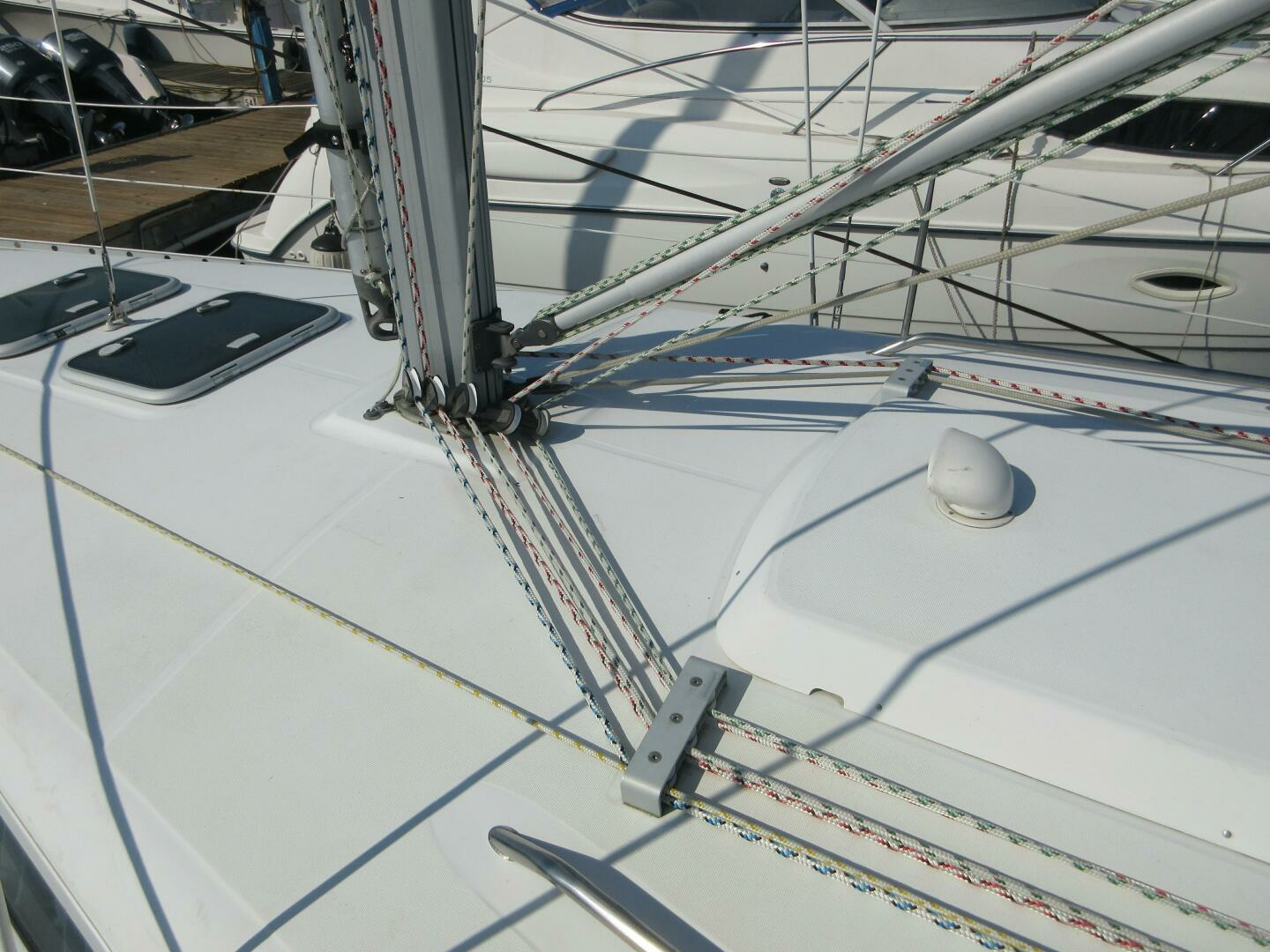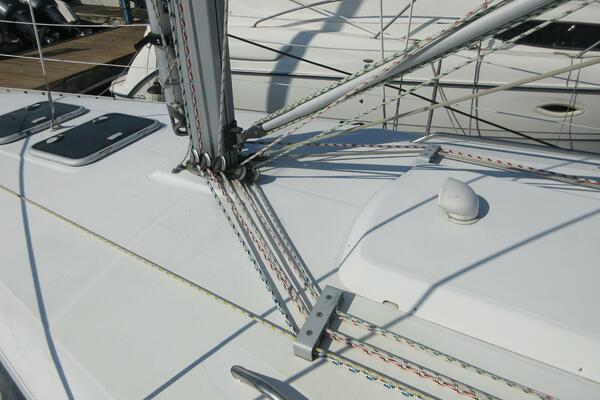 All the halyards & control lines are color-coded and are led aft to the Cockpit coachroof winches, port & starboard, via line organizers and rope clutches.