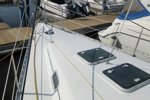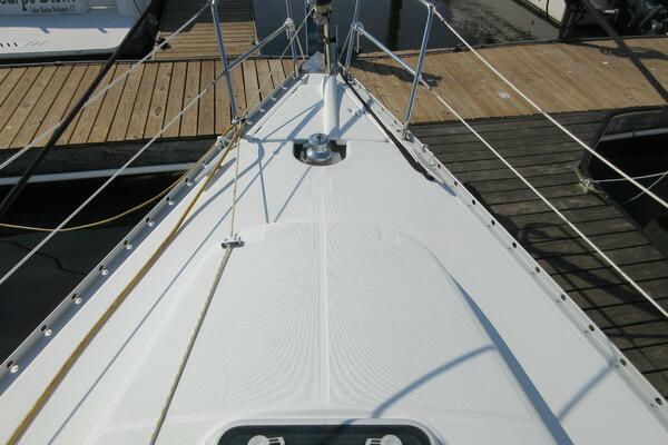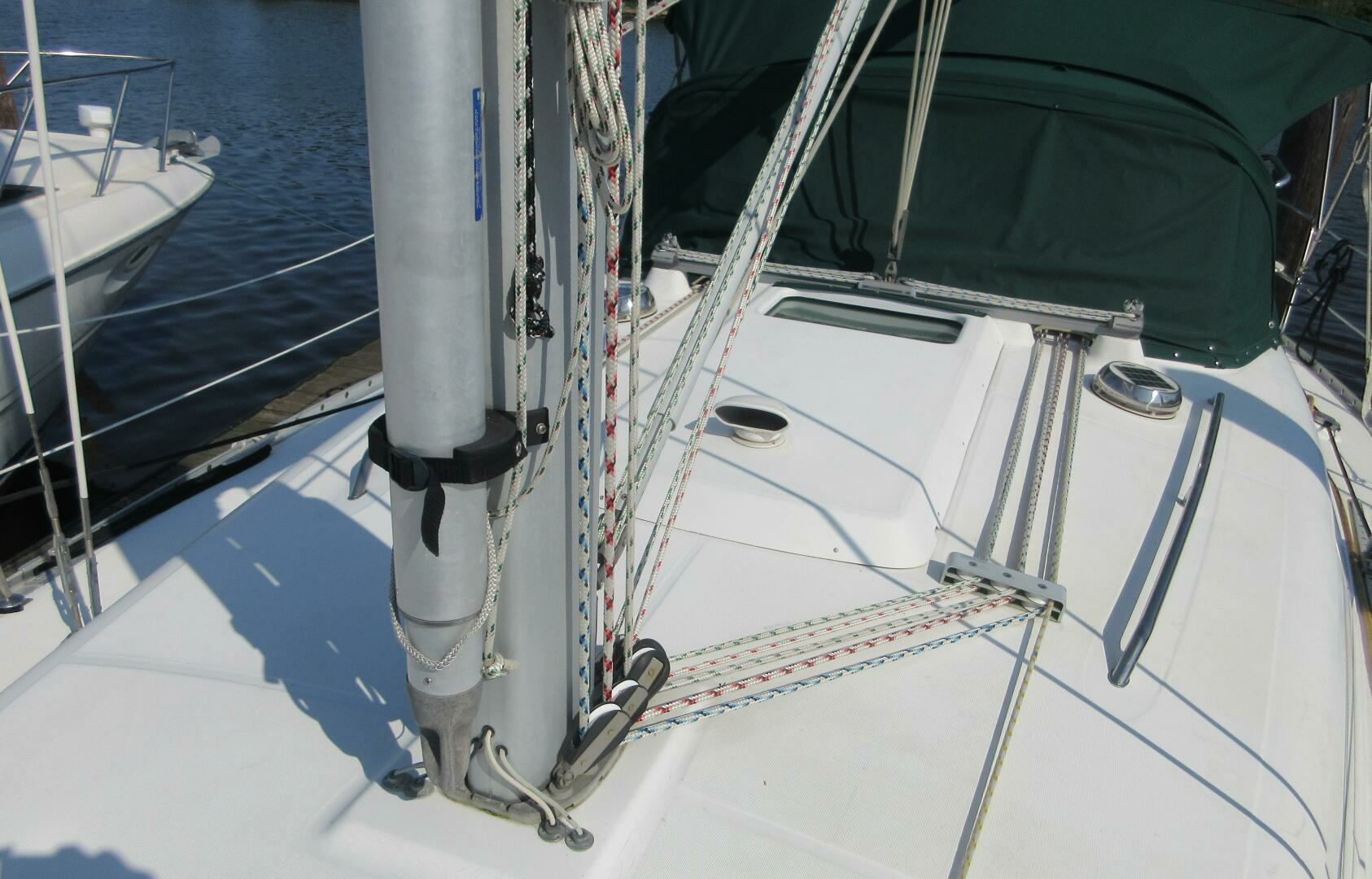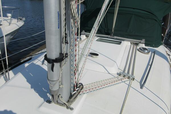 The rig is deck-stepped has (2) sets of aft-swept spreaders and provisions for internal halyards.