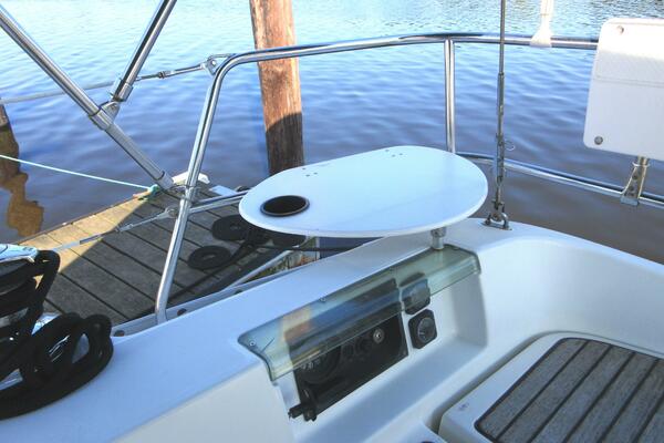The Helm Station has a fiberglass Binnacle to mount the PLASTIMO compass (w/ sliding cover) & to house the electronics & wheel assembly (note: w/ hinged PLEXI cover to protect the electronics)