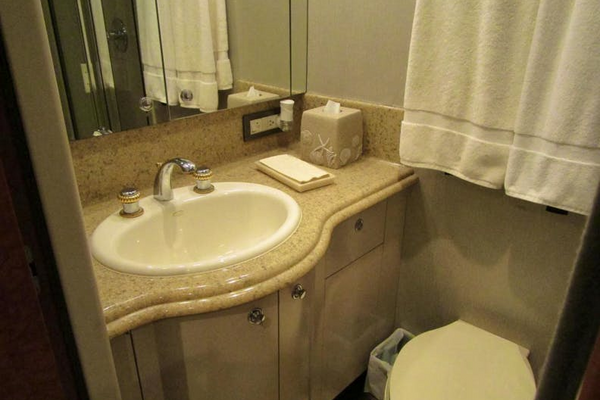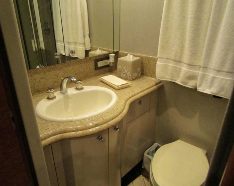 The vanity has two cabinets and a drawer below with an “Autumn Wheat” Corian top and white Kohler sink. Above the sink are two mirrored medicine cabinet doors as well as decorative soffit lights. The toilet is a Galley Maid fresh water model. The sole is marble tile. The FRP stall shower has a clear glass bi-fold door, light and fan.Starboard Twin Cabin