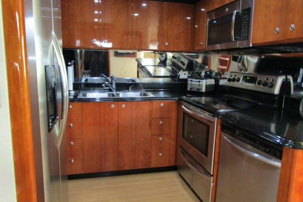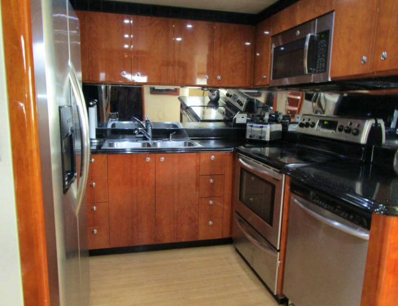 The Galley is located immediately forward of the dining area on the port side. The space is in a U-shaped configuration. The counters are black Avonite “midnight sky” and the sole is the Amtico continuing in from the Salon. Between the cherry cabinets and Avonite counters the backsplash is mirrored to enhance the feeling of spaciousness. A/C delivery is via a three-side soffit for even distribution.
