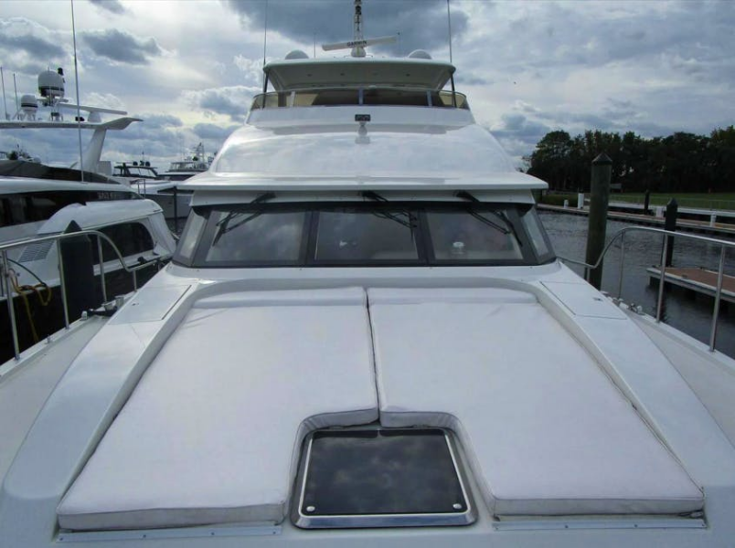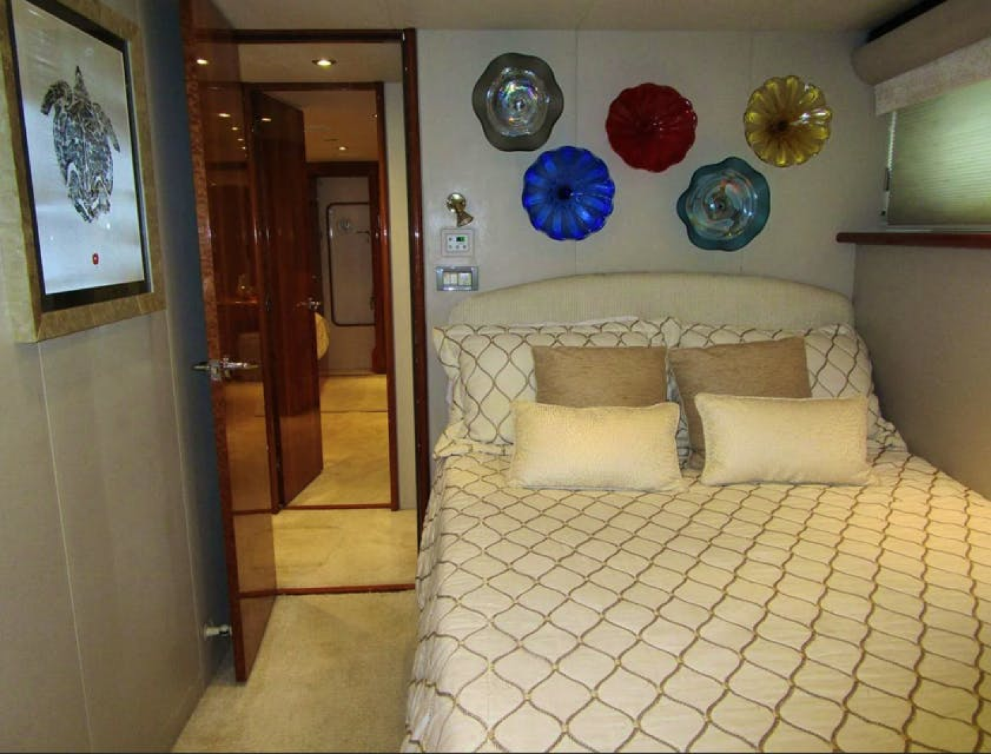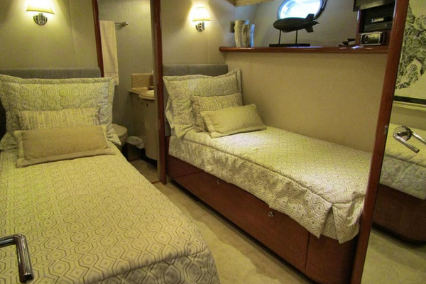 Down 6 carpeted steps is a single cabin to port, a shared head to starboard and a VIP cabin forward.Captains Quarter