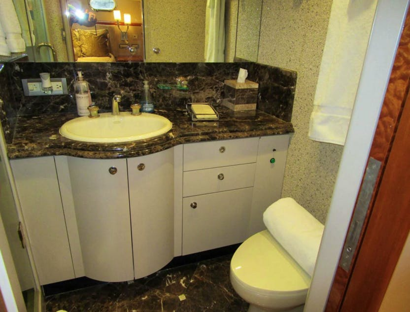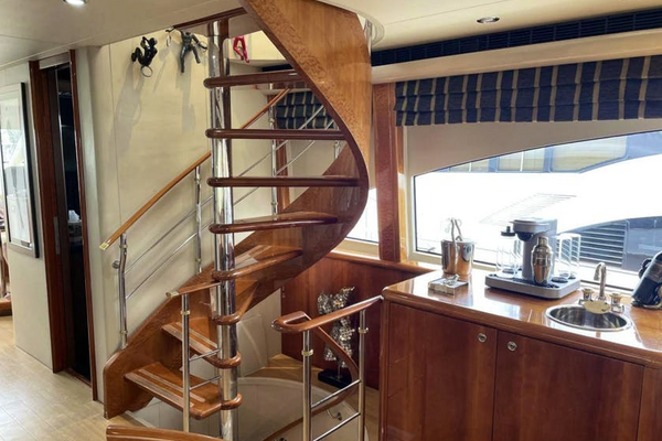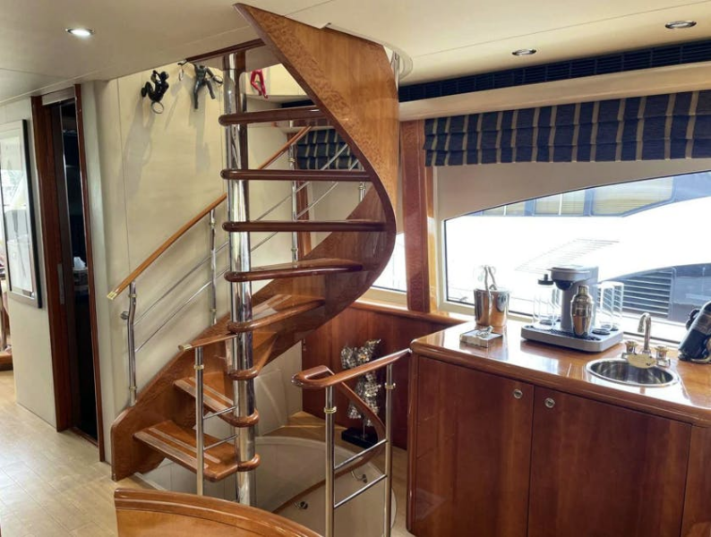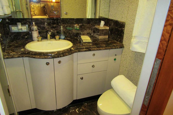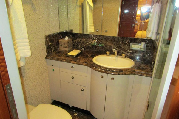 Just aft of the VIP cabin and opposite the captain’s cabin is a large shared head with a three cabinet, one drawer vanity below a Corian type counter top with a Kohler sink. Four mirrored medicine cabinets above offer great storage. The head is a Galley Maid toilet set upon marble tiles. The stall shower has a tempered glass bi-fold door, a seat, an overhead fixture, a shelf, a light and an exhaust fan. The head has five overhead lights, an A/C vent and a mirrored overhead.Lower Companionway